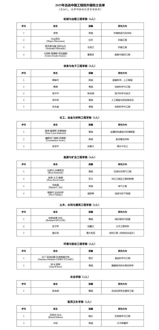 院士增选总体情况 - 中国工程院2025年外籍院士增选共选举产生24位中国工程院外籍院士 [1] 机械与运载工程学部 - 学部增选4位外籍院士,分别来自英国、日本、乌克兰和葡萄牙 [4] - 研究方向涵盖机械制造与自动化、机械工程、船舶与海洋工程 [4] 信息与电子工程学部 - 学部增选5位外籍院士,分别来自英国、美国、新加坡和奥地利 [6] - 研究方向集中在数据科学、人工智能、控制科学与工程、电子科学与技术及供应链优化 [6] 化工、冶金与材料工程学部 - 学部增选3位外籍院士,分别来自美国、英国和加拿大 [8] - 研究方向包括金属材料腐蚀与环境断裂、航空复合材料、高分子化工 [8] 能源与矿业工程学部 - 学部增选4位外籍院士,分别来自美国、芬兰、英国和俄罗斯 [10] - 研究方向覆盖石油与天然气工程、动力工程及工程热物理、电气工程、地质与矿产探测 [10] 土木、水利与建筑工程学部 - 学部增选2位外籍院士,分别来自德国和澳大利亚 [12][13] - 研究方向包括城乡规划与发展、结构工程(结构优化设计) [12][13] 环境与轻纺工程学部 - 学部增选2位外籍院士,分别来自荷兰和美国 [14][15] - 研究方向为食品科学与工程、健康相关的水微生物学 [15] 农业学部 - 学部增选1位外籍院士,来自德国 [16][17] - 研究方向为合成生物学及遗传工程 [17] 医药卫生学部 - 学部增选2位外籍院士,分别来自瑞士和英国 [18][19] - 研究方向为生物医学与工程、分子肿瘤学 [19]