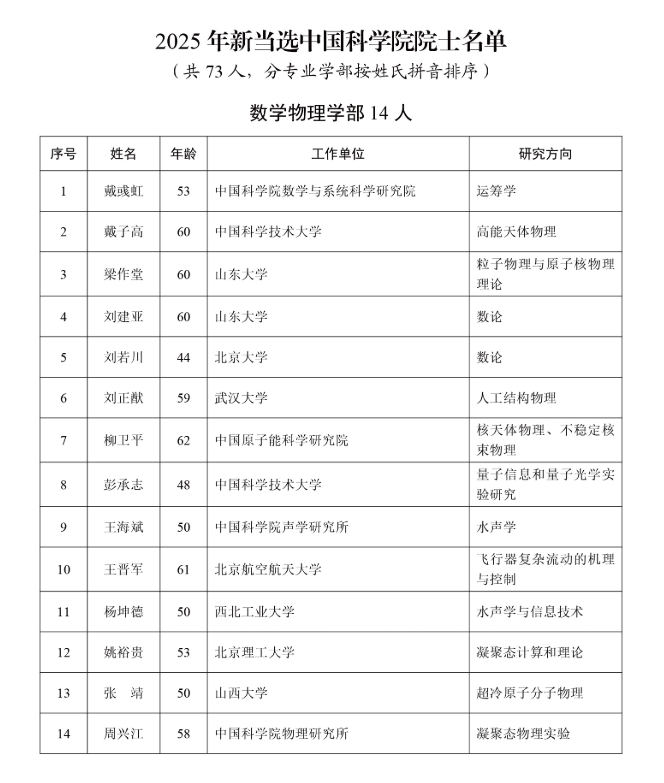 中国科学院公布2025年院士增选结果,73人当选