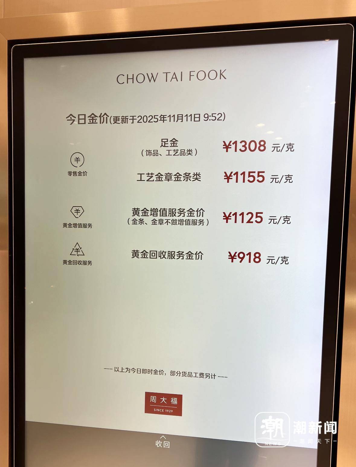 潮新闻客户端 记者 吴恩慧 "还想等黄金再回调,没想到直接拉起来了,连银行投资门槛都跟着上调。"今天早上,杭州郑女士在看到金价大涨的消息后,忍不住感叹:莫非又得追涨? 这两天,黄金价格经过前期回调后再次大涨。11月10日,现货黄金价格持续走高,向上突破4100美元/盎司,为10月27日以来首次,日内大涨2.88%。现货白 银更是大涨4.48%,收于50美元/盎司上方。 11月11日,黄金白银价格继续上涨。受国际贵金属价格大涨影响,国内黄金零售市场价格普遍大幅上涨,周大福、潮宏基等品牌金饰克价报1308元。与此同 时,今天有多家银行宣布上调积存金起购门槛。 这两天在国际金价再次站上4100美元/盎司之后,多家银行又一次调整积存金购买门槛。 11月11日,中信银行公告称,为顺应市场形势变化,自2025年11月15日起,将积存金定期积存计划定时定额最低定投金额从1000元调整为1500元人民币。定 期积存计划定时定量最低定投克重保持不变,仍为1克起存。中信银行将积存金定投最低金额调整为1500元后,已刷新目前行业起购门槛新高。 | | 定金 (饰品、工艺品类) | ¥1308 元/克 | | --- | --- | ...