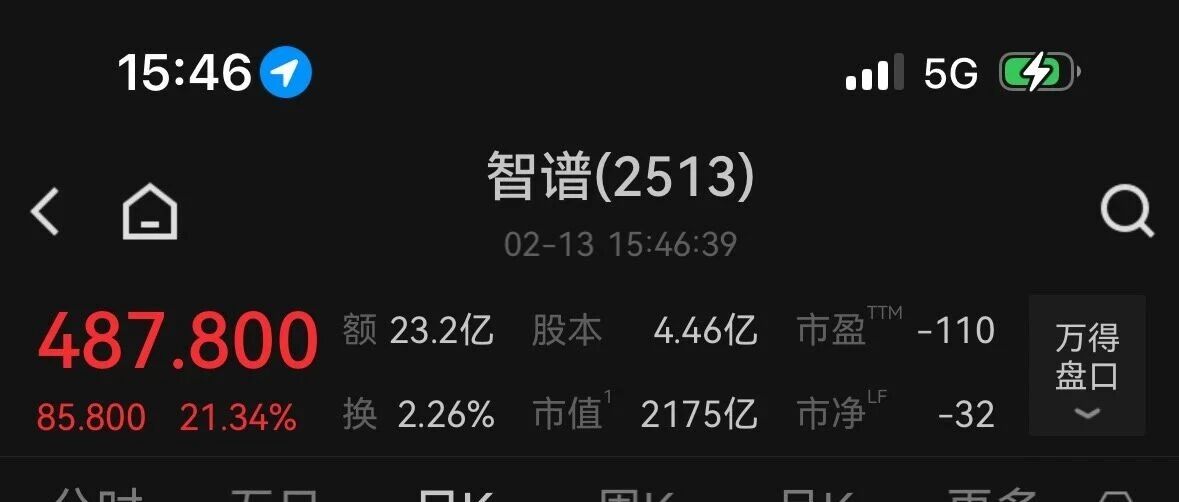 智谱公司股票市场表现 - 公司股票于2026年2月13日收盘价为487.800 [1] - 当日成交额为23.2亿 成交量为500万手 [1] - 当日股价上涨21.34% [1] - 公司总市值为2175亿 总股本为4.46亿 [1] - 股票技术指标显示MA5均线为359.400且呈上升趋势 MA10为291.140 MA20为253.650 [1] - MACD指标中DIF为53.18677 DEA为31.24929 MACD柱为43.87497 [2] - 股票市盈率为90.82 [2] MINIMAX-WP公司股票市场表现 - 公司股票于2026年2月13日收盘价为677.000 [2] - 当日成交额为17.5亿 [2] - 当日股价上涨15.14% 换手率为1.16% [2] - 公司总市值为2123亿 总股本为3.14亿 [2] - 股票技术指标显示MA5均线为566.400且呈上升趋势 MA10为541.550 MA20为484.725 [2] 市场整体情况 - 当日市场有数千只股票下跌 [4]