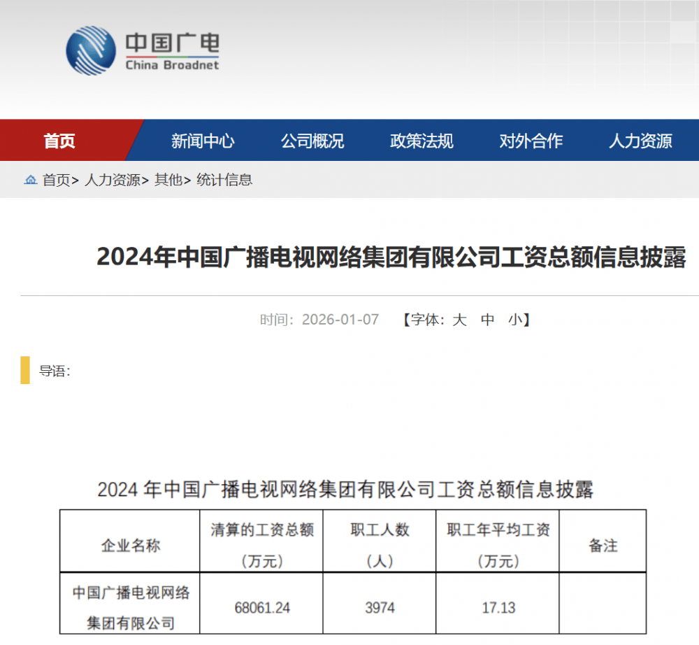 中国广电2024年度工资分配情况披露 - 2026年初 中国广播电视网络有限公司首次披露2024年度直属企业工资分配情况[1] - 2024年 公司职工总数为3,974人 较上年减少154人 但工资总额同比增长1,735万元 达到68,061.24万元 职工年平均工资上升至17.13万元 较上年增加1.06万元[4] - 这已是公司连续两年实现“减员增薪” 上一统计年度(2023年)职工人数减少257人 人均薪酬提高约3,000元 而2024年度人均薪酬涨幅突破万元[7] 中国广电历史薪酬与人员数据对比 - 2021年 公司职工人数为2,209人 职工年平均工资为14.23万元[5] - 2022年 职工人数大幅增长97.4%至4,361人 职工年平均工资增长10.8%至15.77万元[6][8] - 2023年 职工人数减少5.3%至4,128人 职工年平均工资增长1.9%至16.07万元[7][8] - 2024年 职工人数进一步减少3.7%至3,974人[8] 公司战略与管理背景 - 公司管理层曾明确提出“强化基层收入保障 以薪酬激励增强员工归属感与责任感” 此次薪酬数据变化呼应了这一导向[8] - 中国广电自2014年5月28日正式挂牌 注册资本达53.8亿元 由广电总局组建并代管 财政部代表国务院履行出资人职责 业务层面接受广电总局与工业和信息化部的双重行业监管 企业高层管理人员任免由广电总局参照厅级干部管理权限执行[8] 业务发展与行业地位 - 在业务能力建设方面 公司逐步构筑起覆盖广电与通信两大领域的资质壁垒[10] - 2022年 公司先后获批广电5G视听融合业务许可及固定通信业务牌照 标志着其正式迈入“广电+通信”全业务运营阶段[10] - 依托政策红利 中国广电连续三年(2021—2023)入选“全国文化企业三十强” 行业地位与综合实力持续获得认可[10] - 纵观十年发展 公司身份已从传统广电运营商转型为具备全业务能力的通信与文化产业双栖主体[12] - 此次工资总额信息的主动披露 体现薪酬分配机制的市场化演进 或将为其他文化企业提供内部激励改革的参照样本[12]