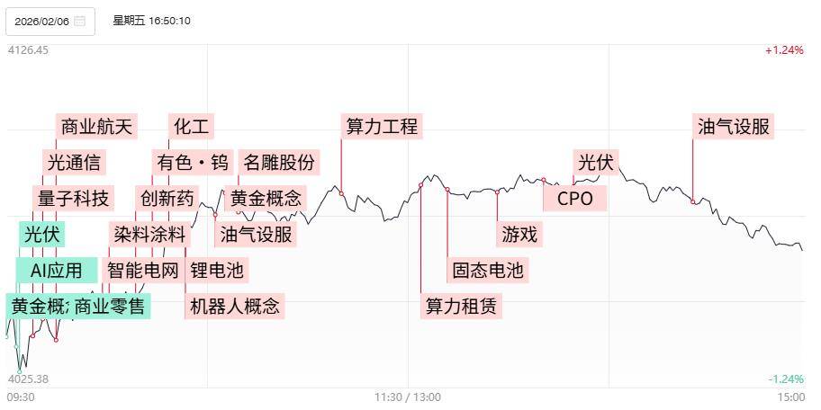 市场整体表现 - 2月6日A股主要指数低开高走午后回落,收盘普跌,沪指跌0.25%报4065.58点,深成指跌0.33%报13906.73点,创业板指跌0.73%报3236.46点,科创综指跌0.35%报1753.61点 [1][2] - 沪深两市成交额2.15万亿元,较上一交易日缩量305亿元 [5] - 全市场个股涨多跌少,超2700只个股上涨,超2500只个股下跌,涨停个股63只,跌停个股10只 [5][6] 行业与板块表现 - 油气化工板块逆势走强,自华燃气涨10.98%,准油股份与洲际油气涨停,多只油气股涨幅显著 [2][3] - 固态电池概念股掀起涨停潮,恩捷股份、三祥新材、科瑞技术等10只个股涨停 [4] - 锂电池、能源金属、人形机器人、金融科技题材走强 [2] - 大消费板块走弱,白酒、零售领跌,AI应用与商业航天概念股回调明显 [2] 个股资金流向 - 主力资金全天净流入电池、电子元件、基础化工等板块 [8] - 个股方面,五洲新春、数据港、天际股份获主力资金净流入额居前,分别为12.20亿元、10.78亿元和10.65亿元 [8] - 主力资金净流出通信、国防军工、传媒等板块,新易盛、中际旭创、航天发展遭抛售额居前,分别为28.83亿元、15.50亿元和13.04亿元 [8] 机构市场观点 - 德讯证券认为市场早盘止跌回升,阶段性企稳迹象明显 [8] - 国金证券建议投资者采用“哑铃策略”进行配置 [8] - 银河证券预计板块轮动仍是春节前主基调,建议关注轮动中的结构性机会 [8]