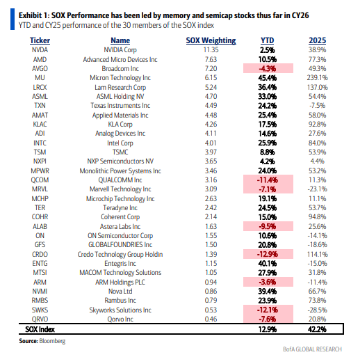 行业焦点转变:从AI训练到推理 - 2026年可能成为AI推理工作负载超越训练的转折之年 [1] - 行业焦点正从训练转向能够真正带来投资回报的推理环节 [1] - 到2030年预计1.2万亿美元的AI资本开支中,推理最终可能占据多数份额或达75% [1][4] AI资本开支与芯片板块表现 - AI资本开支的持续增长正推动芯片板块强劲表现 [1] - 费城半导体指数(SOX)年初至今上涨约13%,创下过去20年中第二好的1月表现,远超标普500指数仅1%的涨幅 [1] - 这轮上涨由存储芯片、半导体设备商以及模拟芯片厂商引领,而非由计算领域龙头英伟达和博通推动 [1] - 超大规模云服务商强调AI投资对维持两位数增长至关重要,其表态为市场注入信心 [2] 主要芯片公司表现与前景 - 英伟达保持领先地位,拥有最广泛的产品管线,涵盖训练与推理领域,并具备供应保障优势 [5] - 博通与谷歌、Anthropic保持良好合作关系,并在OpenAI、苹果和xAI获得新机会 [5] - AMD作为英伟达通用芯片的可靠第二供应商 [5] - 存储和半导体设备供应商的机会持续存在,尽管近期大涨后波动性可能加大 [5] - 根据表格数据,年初至今部分公司股价涨幅显著:美光科技上涨45.4%,拉姆研究上涨36.4%,ASML上涨33.0%,应用材料上涨25.4%,英特尔上涨25.9% [2] 推理市场的芯片机会 - 推理工作负载需要一系列在成本和性能上优化的芯片解决方案 [4] - 从GPU、CPU到ASIC等多种硅解决方案都将在推理市场中找到定位 [3] - 市场对谷歌内部自研芯片风险的担忧被夸大,导致博通股价下跌过度 [5] - 市场对台积电2纳米制程的过度担忧导致AMD股价下跌,但该制程进展仍在正轨 [5] 光学连接与铜缆市场 - 光学收发器和组件供应商成为仅次于存储芯片的最强劲芯片板块表现者 [6] - 随着AI集群规模和带宽需求扩大,增加光学连接的必要性毋庸置疑 [6] - 除Meta外,超大规模云服务商对共封装光学的兴趣证据有限,原因是其运营复杂度更高 [6] - 据Lightcounting分析,CPO销售在2026/27年预计仅占约460亿美元以太网收发器市场的约1%(约5亿美元) [6] - 铜缆仍具相关性,建议买入主动电缆领导者Credo Technology Group [6]