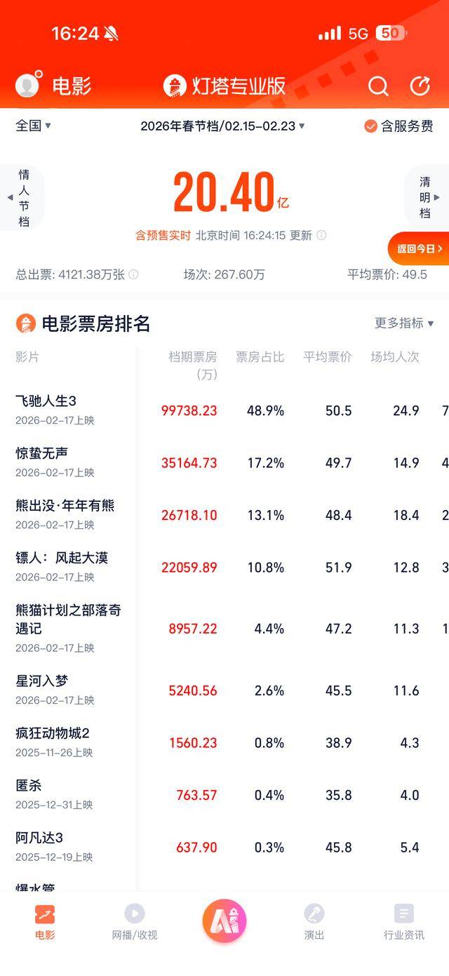 2026年电影市场整体表现 - 截至2月19日11时14分,2026年年度总票房(含预售)突破50亿元[1] - 2026年春节档档期总票房(含预售)突破25亿元,占年度总票房的一半以上[1] - 大年初一全国影院排映场次超56.94万场,大幅刷新中国影史单日场次最高纪录[3] - 大年初一平均票价为49.8元,较去年同期的51.3元有明显下调[3] 头部影片票房排名与表现 - 2026年年度票房榜前三名暂为《飞驰人生3》、《疯狂动物城2》、《匿杀》[1] - 2026年春节档票房前三名分别为《飞驰人生3》、《惊蛰无声》、《熊出没·年年有熊》[1] - 具体影片票房数据(单位:万元)及市场份额:《匿杀》43,583.05万元(占比8.7%)[3]、《阿凡达3》42,182.54万元(占比8.4%)[3]、《惊蛰无声》42,147.39万元(占比8.4%)[3]、《熊出没·年年有熊》31,811.64万元(占比6.3%)[3]、《镖人:风起大漠》27,896.72万元(占比5.5%)[3]、《寻秦记》25,076.39万元(占比5.0%)[3]、《重返寂静岭》14,145.63万元(占比2.8%)[3]、《爆水管》13,190.66万元(占比2.6%)[3] 影院运营与观众消费趋势 - 春节档期间影院客流旺盛,杭州多家影院人头攒动,检票口排起长队[5] - 影院将首场放映时间提前至早上9点,并增派人手保障检票与卖品服务[5][9] - 影院卖品销售火爆,例如某影院爆米花下午已销售八九筐,预计晚上还需补充[7] - 新春套餐(如爆米花加可乐)持续热销[7][9] 新兴购票模式与消费刺激政策 - AI购票成为新潮流,通过千问等AI工具在大麦平台购买电影票的订单量大幅上涨[10] - 2月17日前两天,AI购票订单环比增长372倍,其中三四线城市AI订单量暴涨782倍[10] - 浙江省推出“周末看电影,浙里更精彩”电影消费券活动,总金额达3680万元以上,覆盖多个平台[10] - 消费券形式包括20元单人券、40元双人券、60元三人券及浮动红包,活动时间为2月13日至2月23日[10] - 浙江宁波、嘉兴、义乌等多地推出叠加观影福利,形成省市区三级联动的促消费格局,并与景区、餐饮优惠联动[10]
