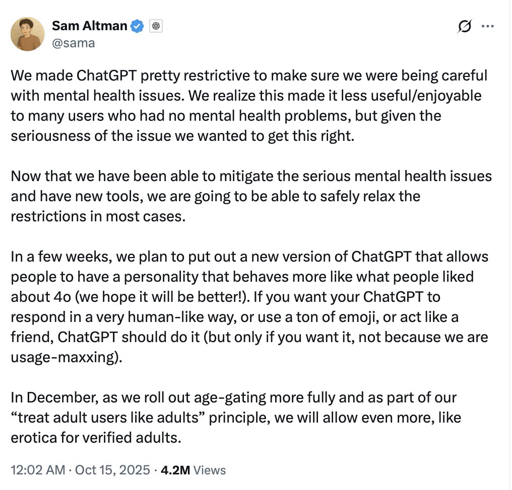 OpenAI内容策略调整 - OpenAI计划在未来几周推出新版本ChatGPT,并在12月推出更全面的年龄分级系统,允许通过成年验证的用户生成成人内容 [2][5] - 公司认为过于严格的内容限制影响用户体验,新技术能在保证安全的前提下提供更多自由度和多样化的内容 [2][4][5] - 新版本将展现更具个性化的回应方式,使AI互动更亲切自然,带有更多幽默和表情符号 [3] AI行业安全挑战与应对 - AI快速发展暴露了严重安全隐患,包括自杀引导、恶意伪造和色情内容泛滥等问题 [7][8] - OpenAI于9月宣布将推出专为18岁以下用户设计的“青少年”版本,自动识别未成年用户并屏蔽图像类和性相关内容,在用户出现心理危机时启动紧急响应机制 [9] - Meta于10月14日宣布Instagram将启用PG-13电影分级制度,未满18岁用户默认只能看到符合该标准的内容,并推出更严格的“有限内容”过滤功能 [11] AI陪伴趋势与商业化潜力 - AI应用场景从智能助手向情感陪伴的社交互动方向发展,个性化和情感化处理是潜力所在 [13][15] - Character.AI以个性化、UGC特点获得用户青睐,其核心技术团队被谷歌以27亿美元(约合人民币193.8亿元)挖走,公司预计到年底年化收入将达到5000万美元,较此前预测的3000万美元大幅增长 [13][15] - ChatGPT未来可能成为用户的“虚拟朋友”,情感和陪伴可能成为AI发展的新趋势,但同时也带来用户对虚拟世界依赖等伦理挑战 [15]