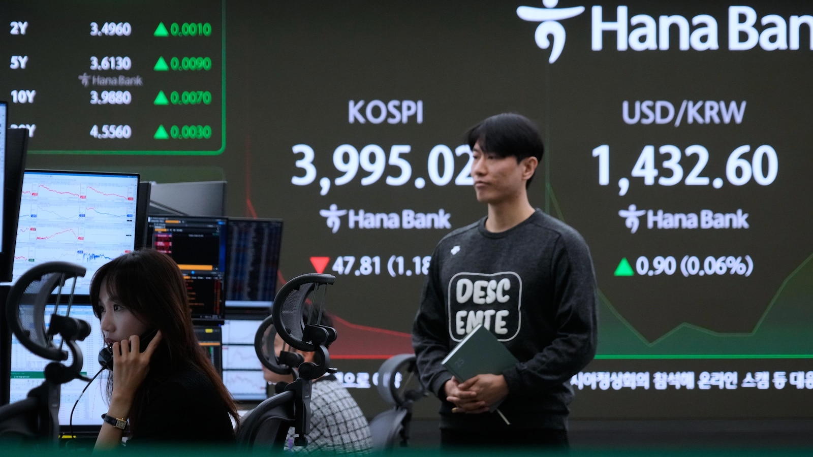 Global shares are mostly lower as investors watch to see what might come of a planned meeting between President Donald Trump and China's top leaderA currency trader talks on the phone near a screen showing the Korea Composite Stock Price Index (KOSPI) and the foreign exchange rate between U.S. dollar and South Korean won, right, at the foreign exchange dealing room of the Hana Bank headquarters in Seoul, South Korea, Tuesday, Oct. 28, 2025. (AP Photo/Ahn Young-joon)TOKYO -- Global shares were mostly lower o ...