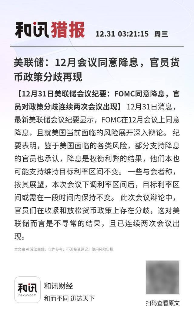 【12月31日美联储会议纪要:FOMC同意降息,官员对政策分歧连续两次会议出现】12月31日消息, 最新美联储会议纪要显示,FOMC在12月会议上同意降息,且就美国当前面临的风险展开深入辩论。 纪要表明,鉴于美国面临的各类风险,部分支持降息的官员也承认,降息是权衡利弊的结果,他们本也 可能支持维持目标利率区间不变。 一些与会者称,按其展望,本次会议下调利率区间后,目标利率区 间或需在一段时间内保持不变。 此次会议辩论中,官员们在收紧和放松货币政策上存在分歧,这对美 联储而言是不寻常的结果,且已连续两次会议出现。 本文由 AI算法生成,仅作参考,不涉投资建议,使用风险自担 扫码查看原文 FOG hexun.com 和讯财经 和而不同 迅达天下 ...