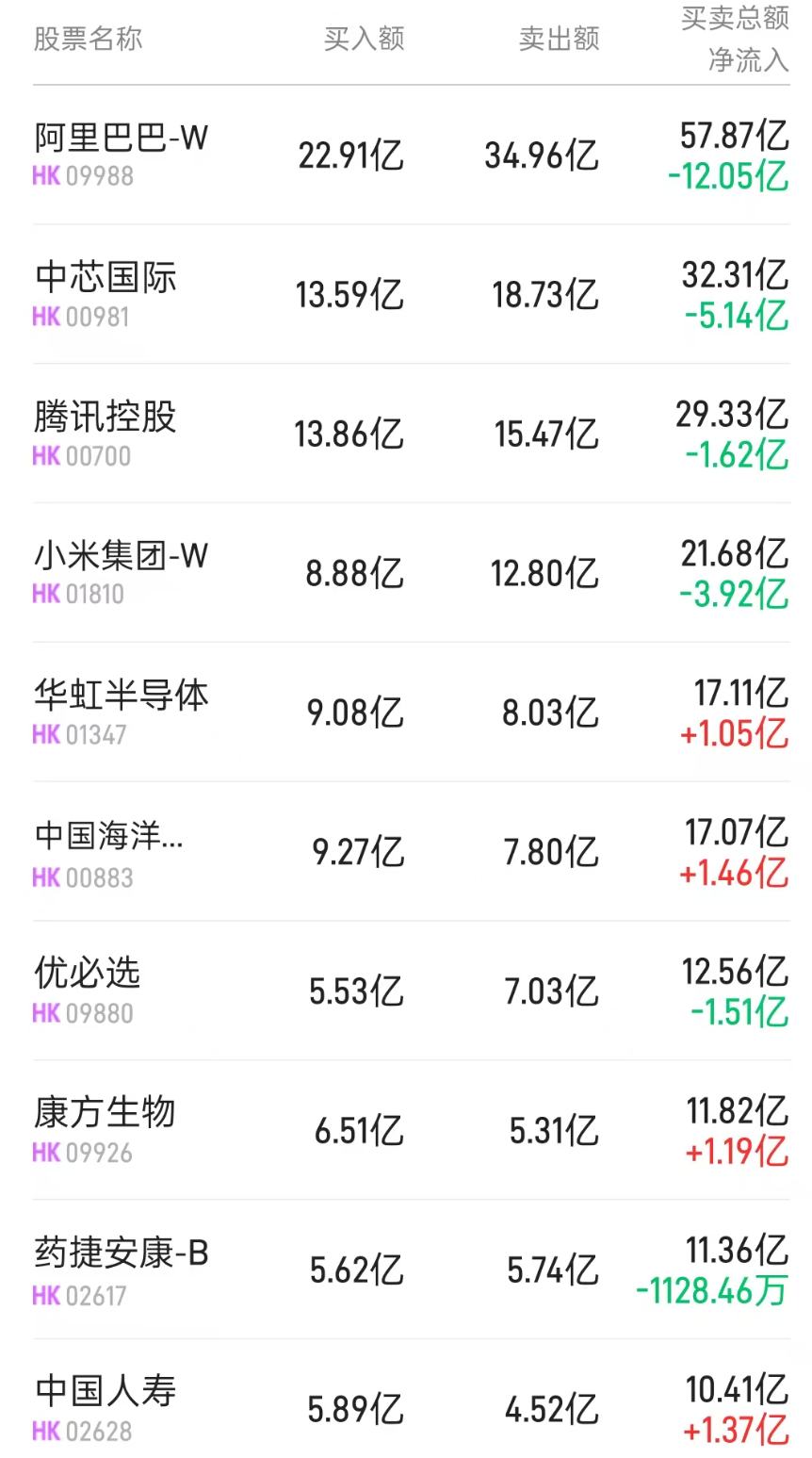 10月20日港股市场,北水成交净卖出26.7港元,其中港股通(沪)成交净卖出22.86亿港元,港股通(深)成交净卖出3.84亿港 元。 北水净买入最多的个股是南方恒生科技(03033)、中海油(00883)、中国人寿(601628)(02628)。北水净卖出最多的个股是阿 里巴巴-W(09988)、小米集团-W(01810)、中芯国际(00981)。 | 股票名称 | 买入额 | 卖出额 | 买卖总额 | | --- | --- | --- | --- | | | | | 净流入 | | 阿里巴巴-W | 22.91亿 | 34.96亿 | 57.87 亿 | | HK 09988 | | | -12.05 Z | | 中芯国际 | 13.59 亿 | 18.73亿 | 32.31亿 | | HK 00981 | | | -5.14 Z- | | 腾讯控股 | 13.86 乙 | 15.47 亿 | 29.33 乙 | | HK 00700 | | | -1.62 Z | | 小米集团-W | 8.88 亿 | 12.80 亿 | 21.68亿 | | HK 01810 | | | -3.92 Z- | | ...