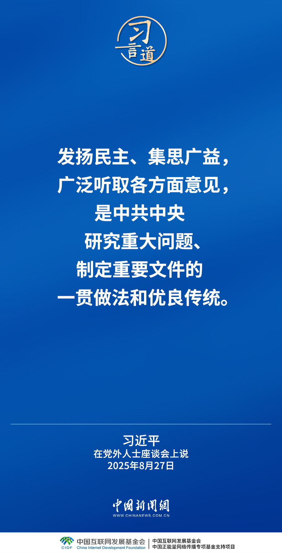 习言道|积极识变应变求变,牢牢把握战略主动 中国互联网发展基金会 | 中国互联网发展基金会 China Internet Development Foundation | 中国正能量网络传播专项基金支持项目 "十五五"时期 是基本实现社会主义现代化 770 分头巷何、 王国权力的 中共中央8月27日在中南海召开党外人士座谈会,就中共中央关于制定国民经济和社会发展第十五个五年规划的建议听取各民主 党派中央、全国工商联负责人和无党派人士代表的意见建议。中共中央总书记习近平主持座谈会并发表重要讲话强调—— 习近平 在党外人士座谈会上说 2025年8月27日 中國 狗闻網 WWW.CHINANEWS.COM.CN 关键时期。 习近平 在党外人士座谈会上说 2025年8月27日 中國 狗闻網 WWW.CHINANEWS.COM.CN CIDF 中国互联网发展基金会 | 中国互联网发展基金会 China Internet Development Foundation 丨中国正能量网络传播专项基金支持项目 要密切跟踪、 精准研判国际形势, 积极识变应变求变, c 牢把握战略主动。 元论外部环境怎么变化, 都要集中力量 办好 ...