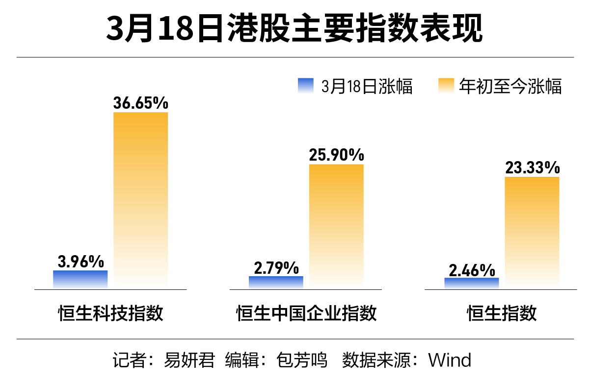 港股市场整体表现 - 3月18日,港股主要股指大幅上涨,恒生科技指数全天大涨3.96%,恒生中国企业指数和恒生指数分别上涨2.79%和2.46% [1] - 自年初以来,港股主要股指表现持续领涨全球市场,截至3月18日,恒生指数、恒生中国企业指数、恒生科技指数年内涨幅分别为23.33%、25.90%和36.65% [4] - 同期,A股主要指数涨幅相对较小,全A指数和科创50指数涨幅分别为6.87%和10.20% [4] 科技与互联网板块 - 3月18日,互联网科技股表现强势,百度集团-SW股价上涨逾12%,地平线机器人-W股价涨逾6% [1] - 自2月以来,南向资金流入高度聚焦科技股,春节以来增持前十大个股共计1330.9亿港元,占南向整体流入的55%,其中阿里巴巴获净流入734.6亿港元,占全部流入的31% [5] - 机构看好AI及科技互联网板块,特别是在国产大模型推动下,AI基础设施提供商和算力相关标的正迎来估值重构窗口 [7] - 科技股企业盈利表现强劲,成为推动港股上涨的重要力量 [2] 汽车与消费板块 - 3月18日,造车“新势力”股价上涨,蔚来-SW和理想汽车-W股价分别上涨8.95%和6.76% [1] - 消费板块表现突出,3月18日恒生非必需性消费指数上涨4.02%,港股消费ETF涨逾3% [2] - 港股消费板块估值当前处于历史较低位置,具备较高安全边际和折价空间 [7] - 《提振消费专项行动方案》的落地,短期内提振了市场情绪 [2] 医药与生物科技板块 - 3月18日,医药板块表现亮眼,药明合联股价上涨逾12%,药明康德股价涨幅达到10.54% [1] - 恒生医疗保健业指数当日上涨2.55%,恒生医疗ETF和港股创新药50ETF分别上涨3.3%和3.05% [2] - 港股科技板块和生物医药板块估值正面临全面重估 [3] 资金流向与市场驱动因素 - 南向资金大举流入是推动本轮港股行情的重要力量,2025年1月1日至3月17日,南向资金累计净买入金额超过3800亿港元 [5] - 南向资金持续流入可能来自个人与私募的活跃,以及公募与险资的持续配置,近期内地可投港股ETF资金净流入快速抬升,创下月度新高 [5] - 部分险资仍在持续配置港股高分红标的,并小幅增配科技板块,内地公募也明显增配港股科技股 [5] - 国内政策持续发力推动经济基本面企稳回升,为港股上涨提供了基础条件,美联储降息周期延续使得全球资金流向新兴市场,为港股提供了充裕的资金支持 [2] 后市展望与关注点 - 机构判断,港股科技板块短期涨幅较快,可能出现回调,港股市场整体估值仍处于历史低位,具有较高的性价比 [1][7] - 在流动性宽松延续、国内经济复苏以及政策支持的背景下,港股有望延续震荡上行的走势 [7] - 随着各大港股上市公司即将发布2024年财报,需关注各科技公司对于算力资本的投入是否符合预期 [3][6] - 年初以来的估值抬升已经较充分地计提了年内进一步的盈利修复预期,在年报窗口期,如果没有超预期的盈利表现,估值抬升行情有降温的风险 [6] - 后市的上涨动力主要取决于中国经济复苏的进程,特别是后续经济刺激政策的落地情况,以及人工智能大模型落地应用等科技领域的发展动态 [7]
