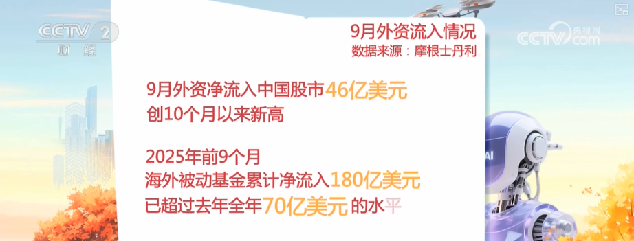数据显示,截至三季度末,北向资金持有A股市值达2.58万亿元,年内累计增加超3000亿元,连续三个季度实现增长。多家外资机构 也传递出看多A股市场的积极信号:高盛近期发布报告,维持对A股和H股超配评级;汇丰私人银行及财富管理中国首席投资总监匡 正表示,科技成长板块是他们配置的主要方向之一。 匡正表示,看好由人工智能和科技自主驱动的科技板块估值的重估,中国领先科技龙头的估值仍然比全球的同业折让差不多30到 40%。 央视网消息:DeepSeek火爆出圈,人形机器人不断迭代……2025年以来,我国在前沿科技领域取得了一系列突破性进展。眼下,以 科技板块为代表的中国资产,吸引了全球资本的目光,全球投资者对中国资产的配置热情持续升温。 根据摩根士丹利最新报告,9月,外资净流入中国股市46亿美元,创10个月以来新高。2025年前9个月,海外被动基金累计净流入180 亿美元,已超过2024年全年70亿美元的水平。摩根资产管理中国资深环球市场策略师蒋先威表示,他们近年来发行了多只A股权益 基金及ETF等产品,积极布局中国市场。 蒋先威介绍,在主动基金的投资管理上,积极提高了相关的仓位。根据最新数据,到2025年中报,他们旗 ...