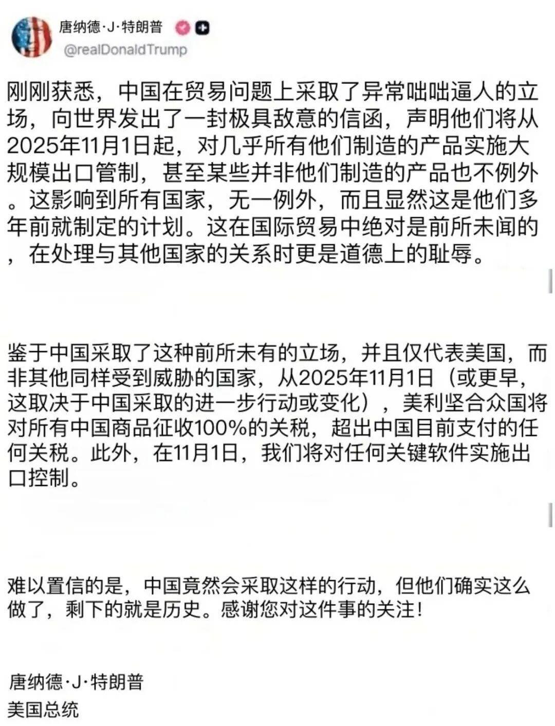 在此之前,该经济体已打出精准组合拳:从稀土出口管制到对美企反垄断调查,再到对美籍船舶加征费用,环环相扣,既打击美关键产业,又在规则层面占 据道义高地。如今,该经济体手握稀土、市场、制造三大王牌,反制措施合法合规,博弈策略从被动防御转为主动设局。这场博弈让我们看到,该经济体国 力日益强盛,在面对无理挑衅时,既有能力也有底气进行有力反制。我们坚信,该经济体将在这场博弈中坚定前行,维护国家利益,书写新的辉煌篇章。 此次美高层暴怒源于战略误判。其仍认为对方依赖美市场,却忽视该经济体半导体产业链自主加速、外贸结构深度重构等根本转变。反观美方,财政赤字高 企、债务飙升、制造业回流成效有限,此时加征关税无异于火上浇油。 美东部时间10月10日上午,美高层在社交平台发千字长文,威胁对某经济体商品"大规模加征关税",以回应对方稀土出口管制措施。消息发布仅3分钟,标 普500指数市值瞬间蒸发7000亿美元,当日美股遭遇4月以来最惨烈暴跌:道指重挫878点,纳指暴跌3.56%,科技股全线崩盘,全日蒸发1.65万亿美元。市场 用剧烈波动宣告,对"美高层式贸易战"的恐慌已达顶点。 当日美股闭市后,美高层再度发文,抛出更激进威胁:自20 ...