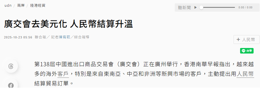 【环球网财经综合报道】环球银行金融电信协会(SWIFT)日前发布报告显示,2025年9月,在基于金额统计的全球 支付货币排名中,人民币全球支付占比为3.17%,位列全球第五大活跃货币,前值为2.93%。 联合新闻网近日发文称,第138届中国进出口商品交易会(广交会)正在广州举行,众多海外客户,尤其是来自东南 亚、中亚和非洲的新兴市场客户主动要求使用人民币进行贸易结算,推动了人民币结算量的增长。 香港文汇报也报导,此次广交会掀起"人民币结算热",许多企业主动"去美元化"。 报道还提到,今年中国人民银行已与八家外国央行签署(含续签)了双边本币互换协议,促进了人民币国际结算趋 势,有助于解决像南美客户缺美元支付货款的问题,显示了人民币国际化和去美元化的进展。 ...