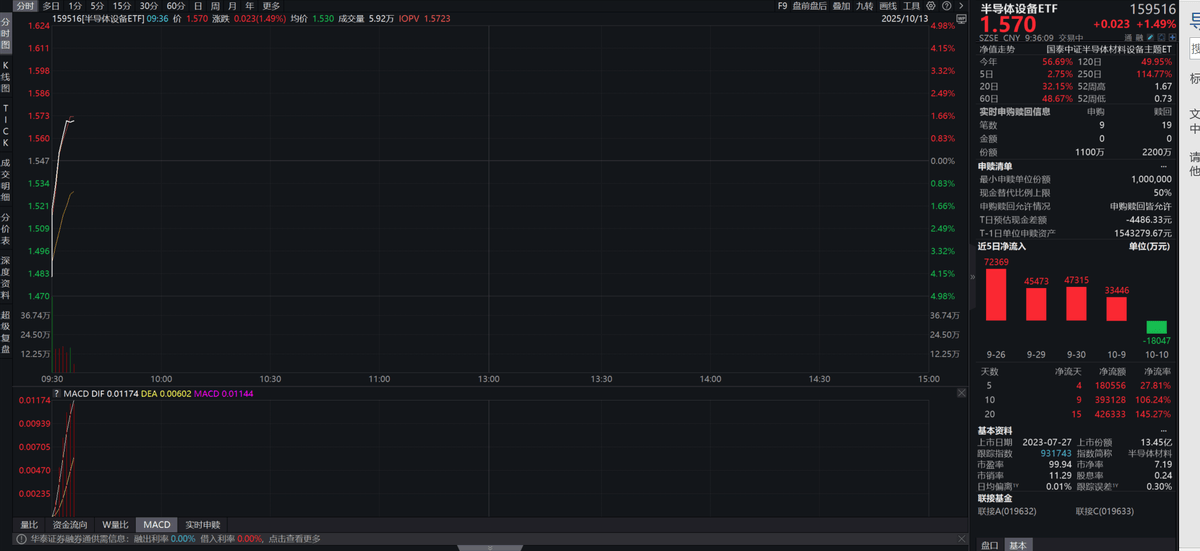 其他领域也出现了AI严重的虹吸效应,并可能持续演化。最近最明显的可能是存储,正是由于AI芯片所需的HBM能带来更高的盈利水平,海外龙头厂商将 先进产能转向HBM和DDR5,旧代产品产能退出过快,因此导致今年以来持续的供需错配,并且,由于目前AI发展加速,相关的产能挤压可能进一步加剧, 存储涨价逻辑确定性逐步走强。 10月13日,受海外关税冲击影响,国内市场呈现普跌。而在盘面普跌之中,自主可控主线逆市上行,聚焦半导体设备领域的半导体设备ETF(159516)盘中 拉升上涨超1.4%。资金持续加码,根据Wind数据,半导体设备ETF(159516)近10日净流入近40亿元。 | 分时 多日 1分 5分 15分 30分 60分 日 周 月 年 更多 | F9 盘前盘后 叠加 九转 画线 工具 ♡ ② > | 半导体设备ETF | 159516[半导体设备ETF] 09:36 价 1.570 涨跌 0.023(1.49%) 均价 1.530 成交量 5.92万 IOPV 1.5723 | 2025/10/13 | 1 | 8 | .570 | 3 A CON 1 | 1.624 | | | | | | | | --- ...