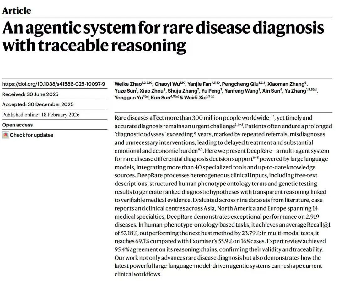 核心观点 - 上海交通大学医学院附属新华医院与上海交通大学联合团队成功研发全球首个“推理过程可追溯”的罕见病人工智能诊断系统DeepRare,相关成果发表于国际顶尖期刊《自然》[1][3] - 该系统通过提供完整的诊断“证据链”,模拟人类医生思维进行诊断,显著提升了罕见病诊断的准确性与可信度,并已进入实际应用阶段[3] 技术突破与核心优势 - 系统实现了“推理过程可追溯”,每项诊断均附带完整“证据链”,解决了传统医疗AI“只给结论、不给依据”的信任难题[3] - 系统采用类人推理逻辑,能够提出假设、寻找证据验证、自我纠正并反复推敲后才下结论[3] - 仅依据临床症状进行首次诊断的准确率达到57.18%,较原有国际最佳模型提升近24个百分点[3] - 结合基因数据后,系统的诊断准确率可超过70%[3] 市场应用与商业化进展 - 系统自2023年7月已上线在线诊断平台,半年内全球已有超过600家医疗机构注册使用,用户涵盖国内大型医院及欧美顶尖实验室[3] - 在上海新华医院已完成内部部署,即将正式投入临床使用,协助医生对罕见病患者进行诊断并“查漏补缺”[3] - 研发团队计划发起全球性罕见病诊疗联盟,并在未来半年内使用两万个真实病例对系统进行进一步验证[4] 行业影响与意义 - 该系统为罕见病诊断领域带来突破,尤其在缺乏基因检测设备的基层医院,可用于对罕见病患者进行有效的初步筛查[3] - 标志着人工智能在医疗诊断领域从“黑箱”操作向透明化、可解释的“白箱”模式迈进,有助于提升AI辅助诊断的临床接受度[3]