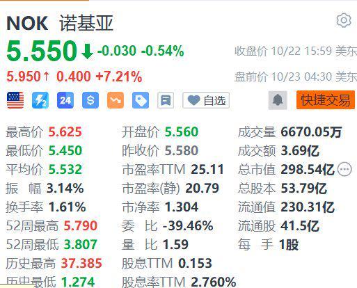 美股异动丨诺基亚盘前涨超7%,Q3调整后营业利润超预期+上调全年利润预期