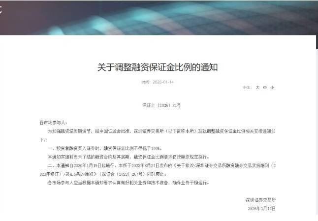 政策调整 - 沪深北交易所于2026年1月14日午间集体发布通知 将投资者融资买入证券时的融资保证金最低比例从80%提高至100% [1] - 此次调整采取新老划断 仅适用于新开融资合约 调整前已存续的合约及其展期不受影响 因此不影响当前26829.92亿元的两融余额 [1] - 交易所表示 近期融资交易明显活跃 市场流动性相对充裕 根据逆周期调节安排 适度提高融资保证金比例有助于降低杠杆水平 保护投资者权益 促进市场稳定健康发展 [1] 历史沿革与市场反应 - 融资保证金比例历史上多次调整 2006年8月规定不低于50% 2015年11月上调至100% 2023年8月从100%降低至80% [2] - 政策发布当日午后 A股三大指数快速回落并集体翻绿 而创业板指和深成指此前一度涨超2% [2] 两融市场近期表现 - 2026年开年以来 A股杠杆资金加速流入 两融余额屡创历史新高并突破2.6万亿元大关 [3] - 开年首周(1月5日至9日)融资净流入规模达857.79亿元 位列A股历史单周第五 其中前四天每日净流入均超百亿元 [3] - 1月7日两融余额达26047亿元 首次突破2.6万亿元并创历史新高 [3] - 1月12日两融余额约26741亿元 再创历史新高 单日增长额约465亿元 为历史第三高 [5] - 截至1月13日 两融余额为26829.92亿元 较前一交易日增加89.30亿元 2026年以来累计增长约1400亿元 [5] 两融账户增长 - 2025年全年新开两融账户达154.21万户 较2024年增加53.36万户 增幅超52% [5] - 2025年末两融账户总数突破1564万户 较2024年末实现跨越式增长 较2018年的阶段性低点40.34万户增长近3.8倍 [5] 市场展望 - 中邮证券研判 2026年两融市场预计将从“高速扩张期”转向“高质量增长期” 余额绝对值仍将创新高 增长动力可能由情绪驱动转向市场深度、机构参与等多轮驱动 [6] - 分析预计 2026年两融余额将在2.6万亿至3.2万亿元区间运行 全年中枢有望落在2.8万亿至3万亿元 增速将较2025年的爆发式增长有所放缓 [6]