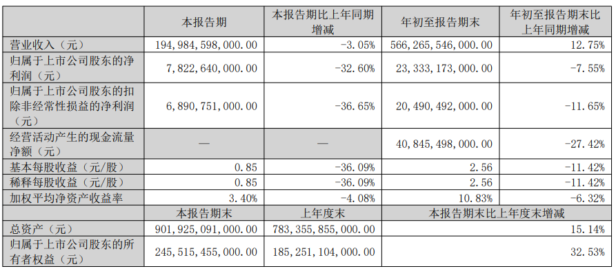 周四,比亚迪发布三季度业绩公告,以下是报告要点: 第三季度营收1950亿元,同比下降3.05%,为近期首次单季度收入负增长;归母净利润78.2亿元,同比暴跌32.6% 前三季度营收5663亿元,同比增长12.75%;归母净利润233亿元,同比下降7.55% 扣非净利润205亿元,同比下降11.65%;经营性现金流408亿元,同比大降27.42% | | 本报告期 | 本报告期比上年同期 | 年初至报告期末 | 年初至报告期末比 | | --- | --- | --- | --- | --- | | | | 增减 | | 上年同期增减 | | 营业收入(元) | 194.984.598,000.00 | -3. 05% | 566, 265, 546, 000. 00 | 12.75% | | 归属于上市公司股东的净 | 7,822,640,000.00 | -32. 60% | 23, 333, 173, 000. 00 | -7.55% | | 利润(元) | | | | | | 归属于上市公司股东的扣 除非经常性损益的净利润 | 6.890.751.000.00 | -36. 65% | 20, 490, ...