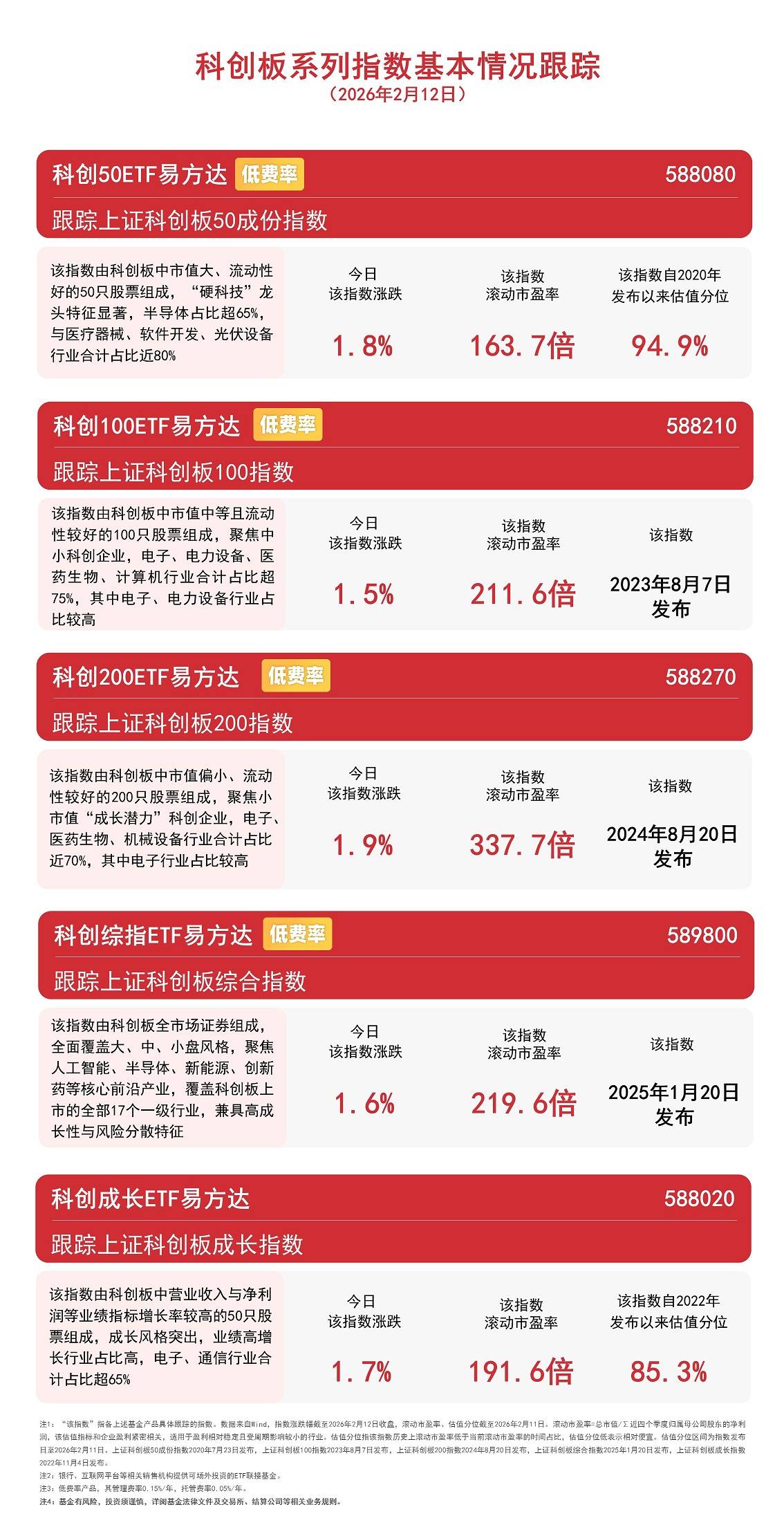 科创板指数及ETF产品表现 - 2月12日,科创200指数上涨1.9%,科创50指数上涨1.8%,科创成长指数上涨1.7%,科创综指上涨1.6%,科创100指数上涨1.5% [1] - 科创50指数滚动市盈率为163.7倍,其估值自2020年发布以来处于94.9%的历史分位,该指数成分股中半导体行业占比超65%,与医疗器械、软件开发、光伏设备行业合计占比近80% [3] - 科创100指数滚动市盈率为211.6倍,该指数于2023年8月7日发布,成分股在电子、电力设备、医药生物、计算机行业合计占比超75% [3] - 科创200指数滚动市盈率为337.7倍,该指数于2024年8月20日发布,成分股在电子、医药生物、机械设备行业合计占比近70% [3] - 科创综指滚动市盈率为219.6倍,该指数于2025年1月20日发布,全面覆盖科创板全部17个一级行业 [5] - 科创成长指数滚动市盈率为191.6倍,其估值自2022年发布以来处于85.3%的历史分位,成分股在电子、通信行业合计占比超65% [5] 半导体及算力板块市场表现 - 2月12日,半导体板块集体上涨,靶材概念股欧莱新材触及20%涨停,晶晨股份涨超15%,翱捷科技涨超13%,芯原股份涨超12% [1] - 同日,算力租赁概念走强,优刻得20%涨停,品高股份涨超10%,青云科技涨超9%,慧辰股份等跟涨 [1]