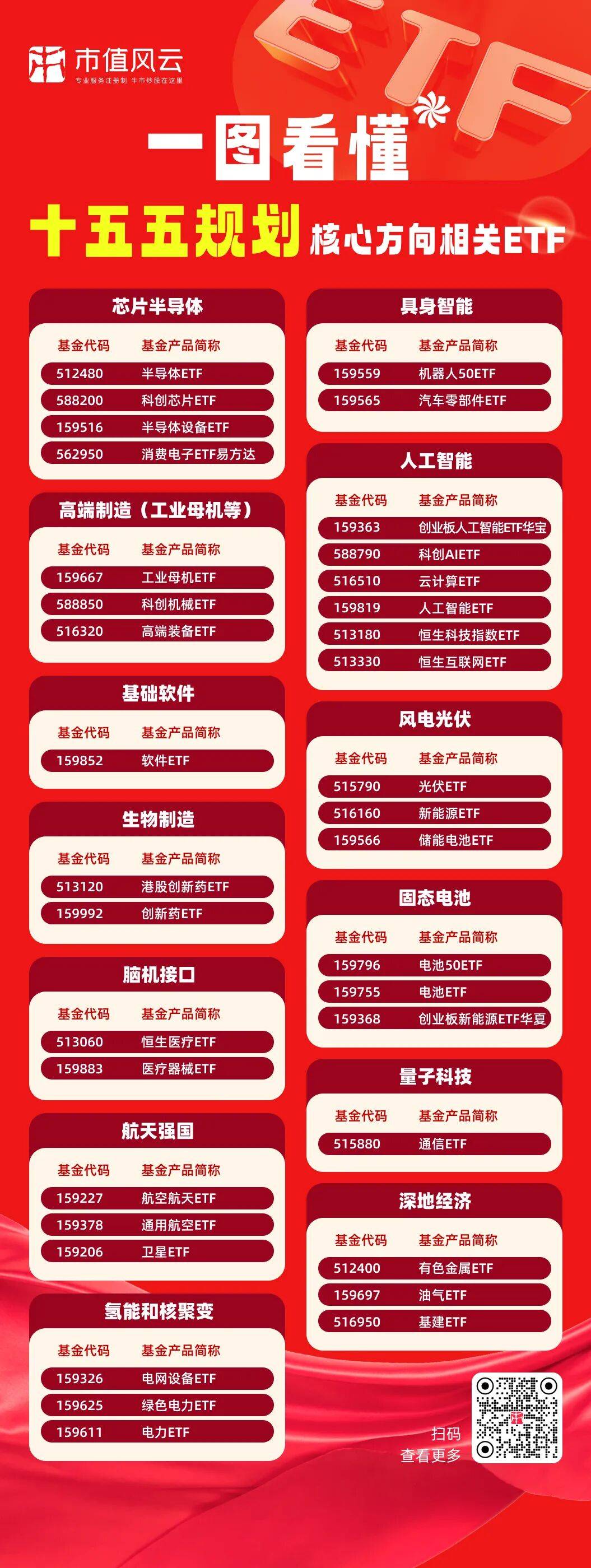 文章核心观点 - "十五五"规划提出加快高水平科技自立自强,构建以先进制造业为骨干的现代化产业体系,为中国高科技产业注入强劲动力[3] - 历史数据显示,作为政策主线的科技板块在政策发布后1~3年整体涨幅优于同期其他大部分板块[3] - ETF是分享"十五五"规划政策红利的理想投资工具[1] 芯片半导体领域ETF - 半导体ETF(512480)、科创芯片ETF(588200)、半导体设备ETF(159516)、消费电子ETF易方达(562950)等产品覆盖芯片半导体产业链[4] 高端制造领域ETF - 工业母机ETF(159667)、科创机械ETF(588850)、高端装备ETF(516320)聚焦工业母机等高端制造领域[5] - 软件ETF(159852)布局基础软件产业[5] - 机器人50ETF(159559)、汽车零部件ETF(159565)涉及智能装备领域[6] 生物医药领域ETF - 港股创新药ETF(513120)、创新药ETF(159992)专注生物制造和医药创新[5] - 恒生医疗ETF(513060)、医疗器械ETF(159883)覆盖医疗健康产业[9] 人工智能领域ETF - 创业板人工智能ETF华宝(159363)、科创AIETF(588790)、人工智能ETF(159819)直接布局AI产业[7] - 云计算ETF(516510)、恒生科技指数ETF(513180)、恒生互联网ETF(513330)覆盖AI相关基础设施和应用[7] 新能源与绿色经济领域ETF - 光伏ETF(515790)、新能源ETF(516160)聚焦光伏新能源产业[8] - 固态电池(159566)、储能电池ETF、电池50ETF(159796)、电池ETF(159755)、创业板新能源ETF华夏(159368)布局电池储能产业链[8][9] - 电网设备ETF(159326)、绿色电力ETF(159625)、电力ETF(159611)覆盖电力能源基础设施[9] 前沿科技与战略产业ETF - 脑机接口(159796)、通信ETF(515880)布局脑机接口和量子科技领域[9] - 航空航天ETF(159227)、通用航空ETF(159378)、卫星ETF(159206)服务航天强国战略[9] - 有色金属ETF(512400)、油气ETF(159697)、基建ETF(516950)涉及深地经济和资源开发[9]