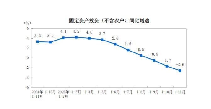 国家统计局:1-11月,全国固定资产投资(不含农户)同比下降2.6%,制造业投资增长1.9%