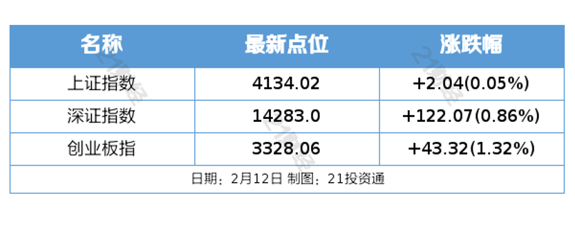 市场行情概览 - 2月12日A股三大指数集体收涨,沪指涨0.05%至4134.02点,深成指涨0.86%至14283.0点,创业板指涨1.32%至3328.06点,科创50指数涨超1% [1][2] - 市场成交额显著放量,沪深两市成交额达2.14万亿元,较上一交易日增加1575亿元 [1] - 市场呈现分化格局,全市场超3200只个股下跌,微盘股指数跌超1% [1] - 隔夜美股三大股指显著下跌,道琼斯指数跌1.34%,纳斯达克指数跌2.03%,标普500指数跌1.57% [3][4] - 欧洲股市涨跌不一,英国富时100指数跌0.67%,法国CAC40指数涨0.33%,德国DAX指数微跌0.01% [3] - 国际商品市场方面,纽约WTI原油期货价格下跌2.77%至每桶62.84美元,COMEX黄金期货价格下跌3.08%至4941.40美元 [3][4] 行业与板块表现 - 算力产业链集体爆发,算力租赁、CPO、算力芯片、液冷服务器等概念板块表现活跃 [1] - 电网设备概念集体走强 [1] - 大消费板块集体走弱,影视院线、旅游酒店、零售、食品饮料等板块跌幅居前 [1] - 主力资金流向显示,互联网服务、半导体、电网设备、专用设备、电源设备为净流入前五大行业,净流入额分别为63.26亿元、56.72亿元、47.50亿元、23.09亿元、18.80亿元 [17] - 银行、文化传媒、玻璃玻纤、化学制药、航天航空为净流出前五大行业 [17] - 个股方面,利欧股份、英维克、兆易创新、特变电工、宁德时代为净流入前五大个股,净流入额分别为31.63亿元、16.50亿元、13.35亿元、10.61亿元、9.66亿元 [18] - 新易盛、光线传媒、胜宏科技、信维通信、中国卫星为净流出前五大个股 [18] 宏观与政策动态 - 央行将于2月13日开展10000亿元买断式逆回购操作,期限为6个月,以保持银行体系流动性充裕 [5] - 国家发改委等三部门发布推动低空保险高质量发展的实施意见,目标到2027年初步建立无人驾驶航空器责任保险强制投保制度,到2030年基本形成低空保险政策框架 [6] - 商务部回应欧盟批准对一款中国制造的大众品牌SUV免征关税,表示中欧双方支持中国电动汽车企业用好价格承诺,期待更多企业与欧方达成一致 [7] - 商务部宣布自2026年2月13日起对原产于欧盟的进口相关乳制品征收反补贴税 [8] - 全国氢能标准化技术委员会就《氢燃料质量要求》等19项国家标准公开征求意见,旨在健全氢能全产业链标准体系 [9] - 深圳市印发行动计划,提出以AI芯片为突破口做强半导体产业,支持面向AI终端及新能源汽车的芯片国产化 [10] 科技创新与产业突破 - 全球首颗面向城市可持续发展的AI大模型卫星“港中大一号”成功发射,创新性地融合了高分辨率遥感与AI技术 [11][12] - 我国科学家研发出新型3D打印技术,0.6秒即可完成毫米尺寸复杂物体的高分辨率三维打印,刷新速度纪录 [13] - 多家车企公布全固态电池产业规划,吉利汽车目标2026年完成样车首发,2027年实现小批量产业化;奇瑞汽车计划2027年启动全固态电池装车示范工作 [14] 机构观点摘要 - 西南证券认为,液冷技术已在头部云厂商与智算中心完成验证并进入规模化部署阶段,渗透率有望随算力投资同步提升,是AI算力链条中具备中期确定性的方向 [15] - 中银国际认为,2026年地产板块出现收益机会较大,部分房企减值压力减轻可能带来反转,部分商业地产公司已提前布局新业态以把握新消费机遇 [15] - 东海证券指出,全球半导体行业2025年销售额创历史新高,涨价潮正从存储芯片蔓延至非存储领域,我国国产化力度超预期 [10] - 中泰证券认为,全球有望进入商业航天产业爆发期,产业长期景气上行趋势不变 [12] - 国泰海通证券指出,3D打印在工业与消费领域需求双向增长下,市场规模呈现快速增长 [13] - 光大证券认为,固态电池方向兼具大主题市值容量、高催化密度及产业从0→1的关键拐点特征,有望成为中长期主线,2026–2027年有望迎来多重共振催化 [14] - 财信证券建议,在原奶周期复苏背景下,关注直接受益的牧业企业及间接受益的乳制品龙头企业 [8] 公司公告与动态 - 双良节能公告间接参与相关商业航天项目,但未直接与SpaceX合作 [16] - 中南文化拟购买苏龙热电控股权,2月13日起停牌 [16] - 华培动力拟发行可转债及支付现金购买美创智感100%股权,股票停牌 [16] - 掌阅科技公告2025年度AI短剧业务收入预计不超过当年主营业务收入的1% [16] - 泰凌微公告国家大基金在2025年12月24日至2026年2月12日期间减持465.13万股,持股比例降至5%以下 [16] - 协创数据拟不超过110亿元采购服务器,用于为客户提供云算力服务 [16] - 晶瑞电材拟6亿元投建西部地区集成电路制造产业链配套关键材料综合基地 [16] - 嘉美包装公告魔法原子资本运作计划完全独立于上市公司,如未来股价进一步异常上涨可能再次申请停牌核查 [16]