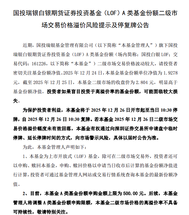 基金基本信息与公告 - 国投瑞银白银期货证券投资基金(LOF) 基金主代码为161226 基金管理人为国投瑞银基金管理有限公司 [2] - 该基金A类份额(代码161226)自2025年12月29日起暂停大额申购 限制申购金额为100元人民币 原因是为保护基金份额持有人利益 [2] - 该基金C类份额代码为019005 [2] 二级市场交易异常与风险警示 - 截至2025年12月25日 该基金二级市场收盘价为2.804元 明显高于基金份额净值 [2] - 近期该基金二级市场价格大幅上涨 遭遇资金爆炒 连续多日涨停 场内交易价格大幅偏离基金份额净值 溢价幅度一度接近70% [3] - 为保护投资者利益 该基金于2025年12月26日开市起至当日10:30停牌 并于10:30复牌 [2] 市场反应与溢价变化 - 各类财经社交平台对该基金热议 场内套利攻略广泛传播 吸引了较多投资者参与套利 [5] - 大量套利资金涌入 该基金在2025年12月26日早上复牌后跌停 溢价幅度收窄至45% [5]