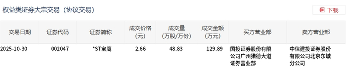 | 权益类证券大宗交易(协议交易) | | | | | | | 团 下载 | | --- | --- | --- | --- | --- | --- | --- | --- | | 交易日期 | 证券代码 | 证券简称 | 成交价格 | 成交量 | 成交金额 | 买方营业部 | 卖方营业部 | | | | | (元) | (万股/万份) | (万元) | | | | 2025-10-30 | 002047 | *ST宝鹰 | 2.66 | 48.83 | 129.89 | 国投证券股份有限 | 中信建投证券股份 | | | | | | | | 公司广州猎德大道 | 有限公司北京东城 | | | | | | | | 证券营业部 | 分公司 | 10月30日,*ST宝鹰大宗交易成交48.83万股,成交额129.89万元,占当日总成交额的19.57%,成交价 2.66元,较市场收盘价2.93元折价9.22%。 ...
