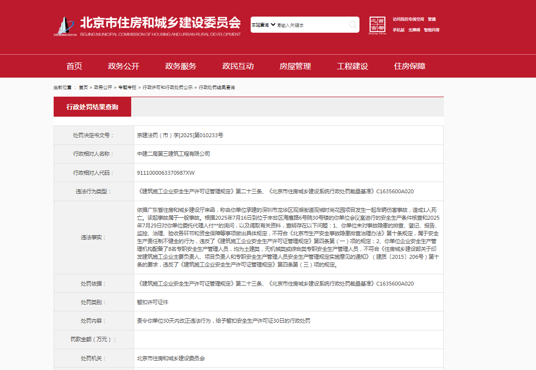 行政处罚事件概述 - 中建二局第三建筑工程有限公司因其承建的深圳市龙华区观湖街道观城时尚花园项目发生一起车辆伤害事故,造成1人死亡,收到北京市住房和城乡建设委员会的行政处罚 [1][2] - 处罚决定书文号为京建法罚(市)字[2025]第010233号,处罚类别为暂扣安全生产许可证30日 [2][3] 安全生产条件核查问题 - 公司未对事故隐患的排查、登记、报告、监控、治理、验收各环节和资金保障等事项做出具体规定,不符合《北京市生产安全事故隐患排查治理办法》第十条,属于安全生产责任制不健全 [2] - 公司企业安全生产管理机构配备了8名专职安全生产管理人员,但均为土建类,无机械类或综合类专职安全生产管理人员,不符合住建部相关要求 [2] 公司背景信息 - 中建二局第三建筑工程有限公司是中建集团所属三级核心骨干企业,成立于1952年,注册资本为120,043.14万元人民币,法定代表人为张春轩 [6] - 公司拥有建筑工程总承包特级资质、建筑设计施工甲级等11项资质,业务聚焦房建、基础设施、专业业务板块,能够承接建筑、公路、市政等业态各类项目 [6]