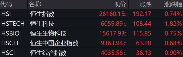 编辑丨瑜见 10月24日,香港恒生指数报收26160.15点,涨0.74%,周涨3.62%;恒生科技指数报收6059.89点,涨 1.82%,周涨5.20%。半导体板块全线走强,华虹半导体涨超13%,中芯国际涨8%;能源、环保等板块 下跌。 | 代码 | 名称 | 现价 | 涨跌 | 涨跌幅 | | --- | --- | --- | --- | --- | | H2l | 恒生指数 | 26160.15c 192.17 | | 0.74% | | HSTECH 恒生科技 | | 6059.89c 108.44 | | 1.82% | | HSBIO | 恒生生物科技 | 15617.93c 115.85 | | 0.75% | | HSCEI | 恒生中国企业指数 | 9363.94c | 63.20 | 0.68% | | HSCI | 恒生综合指数 | 4035.56c | 36.13 | 0.90% | ...