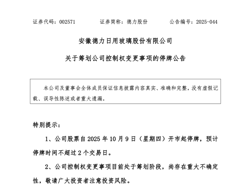 公司控制权变更 - 公司控股股东及实际控制人施卫东正在筹划控制权变更事项 具体交易方案尚需进一步论证和磋商 [1] - 该事项可能导致公司控股股东及实际控制人发生变更 公司股票自2025年10月9日起停牌 预计停牌时间不超过2个交易日 [1] 公司业务发展 - 公司始创于1996年 2011年在深交所上市 从事各类玻璃产品研发、制造 是中国玻璃器皿制造首强企业 全球产能排名第三位 [1] - 公司于2020年11月成立全资子公司德力光能进军光伏玻璃 并于2021年4月20日与隆基绿能签订了五年期光伏玻璃采购协议 [1] - 根据协议 隆基绿能在2022年至2026年向公司采购光伏玻璃不少于2 5亿平方米 根据当时预测合同总金额高达55 31亿元人民币(不含税) [2] - 公司光伏玻璃项目由于供地延迟 到2023年底其产品也未下线 直到2024年4月项目才顺利点火投产 [2] 公司财务状况 - 进军光伏后公司业绩出现持续亏损 2020年公司扣非净利润亏损3100多万元 2024年亏损额扩大到1 2亿元 2025年上半年公司扣非净利润再度亏损4500多万元 [2] - 公司资产负债率从2019年的24%一路飙升到2024年的68% 账上资金覆盖短期有息债务捉襟见肘 [2] - 公司于2025年7月公告出售全资子公司德瑞矿业100%股权 交易价格合计1 35亿元 9月23日公司公告已收到交易款 [4] - 截至2025年9月30日收盘 公司市值为32 61亿元 [4] 行业市场环境 - 公司光伏玻璃项目投产时 光伏行业市场环境已然发生巨大变化 [2]
