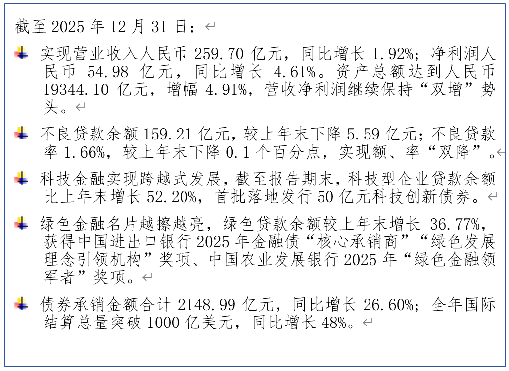 核心财务与经营业绩 - 2025年资产总额达到19344.10亿元,较上年末增长4.91%,负债总额18091.83亿元,增长4.35% [2] - 全年实现营业收入259.70亿元,同比增长1.92%,实现净利润54.98亿元,同比增长4.61% [2] - 成本收入比降至38.01%,较上年降低1.00个百分点 [2] - 发放贷款和垫款余额9497.48亿元,较上年末增长2.64% [3] - 不良贷款余额159.21亿元,较上年末下降5.59亿元,不良贷款率1.66%,下降0.10个百分点,实现“双降” [3] - 拨备覆盖率为162.16%,较上年提升6.97个百分点 [3] 资产负债结构与资产质量 - 资产端重点领域贷款投放增速高于一般性贷款,科技型企业贷款、绿色贷款、制造业贷款分别增长52.20%、36.77%和12.16% [3] - 负债端存款平均付息率在上年下降32个基点基础上,进一步压降41个基点 [3] - 资产质量持续优化,风险抵补能力坚实,各项指标均符合监管要求 [3] “五篇大文章”业务进展 - **科技金融**:科技型企业贷款余额716.83亿元,较上年末增长52.20% [3][6],成功发行50亿元科技创新债券,票面利率1.75% [6] - **绿色金融**:绿色贷款余额593.35亿元,较上年末增长36.77% [3][6],在中国银行业协会绿色银行评价中,评分在全国21家主要银行中位列第一 [6] - **普惠金融**:普惠贷款余额较上年末增长6.87%,平均贷款执行利率4.19%,较上年末下降13个基点 [7] - **养老金融**:个人养老金账户入金金额同比增长46% [7] - **数字金融**:远程经营客户规模达626万人次,同比增长18%,在线渠道交易替代率高达97% [8] “九大银行”战略转型成效 - **公司银行**:公司全量客户较上年末增长13.53% [10],公司存款总额6967.84亿元,增长6.31%,公司贷款总额7124.12亿元,增长8.81% [10] - **交易银行**:表内外业务累计发生额达1.13万亿元,业务余额6758.14亿元,同比增长30.61%,带动对公存款增长超454亿元 [10] - **供应链金融**:全年供应链业务投放达3278.65亿元 [10] - **跨境金融**:国际结算总量突破1000亿美元,同比增长48%,FT账户带动对公存款增长超500亿元 [10] - **司库业务**:累计签约204家企业,结算量突破1716亿元,业务覆盖16个省市 [10] 零售银行业务 - 零售存款余额达2356.44亿元,年增233.69亿元 [11] - 财富管理代销理财规模同比增长11.73%,代销信托规模同比增长15.69%,代销传统保险保费同比增长45.43% [11] - 个人贷款余额2040.08亿元 [11] - 通过平台合作累计服务个人客户2253.63万户,手机银行交易替代率97% [11] - 远程银行客户满意度达99.08% [11] 金融市场业务 - 债券业务全年累计投资额增长142% [12] - 资金交易业务交易量突破15万亿元,同业存单发行5465.6亿元,同比增长35.89% [12]