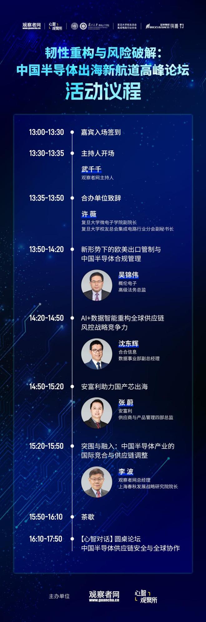在全球半导体产业格局深度调整、地缘政治风险持续外溢的关键时刻,一场聚焦中国半导体企业出海战 略的高规格论坛即将拉开帷幕。 概伦电子 高级法务总监 Al+数据智能重构全球供应链 风控战略竞争力 沈东辉 合合信息 数据事业部副总经理 14:50-15:20 安富利助力国产芯出海 本次活动——中国半导体出海新航道高峰论坛,由观察者网和复旦大学校友总会集成电路行业分会联合 主办,金砖财经作为支持单位,将于2025年10月14日下午在上海绿地外滩中心举行。观察者网将以视频 +图文方式对此次论坛做全方位报道。 本次论坛主旨演讲环节议程如下: 16:10-17:50 张蔚 安富利 供应商与产品管理四部总监 15:20-15:50 突围与融入:中国半导体产业的 ·国际竞合与供应链调整 李波 观察者网总经理 上海春秋发展战略研究院院长 15:50-16:10 【心智对话】圆桌论坛 中国半导体供应链安全与全球协作 主办单位 14:20-14:50 茶歇 lul L 观察所 当前,中国半导体产业正处于从规模扩张向质量跃升的关键窗口期。面对全球供应链加速重构带来的卡 脖子、断链双重困境,出海企业亟需寻找突破路径。新一代AI技术与数字 ...