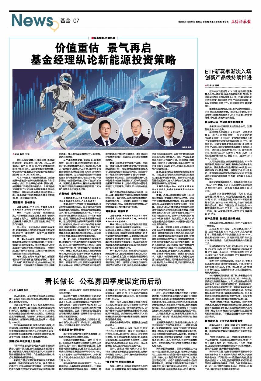 郭晨凯 制图 11 22 程剑 s 130 . ty R. CHENCE list hoped r 李一帆 赵诣 ■公募观澜·把脉机遇 价值重估 景气再启 基金经理纵论新能源投资策略 ◎记者 陈玥 王彭 在经历深度调整后,今年以来,新能源板块迎来一轮显著的上涨行情。Choice数据显示,截至10月13 日,中证新能源指数年内上涨近40%,国证新能源车电池指数、中证光伏产业指数及中证储能产业指数 分别上涨63.1%、21.1%和32%。 与上一轮资本开支高峰期相比,当前新能源产业链基本面情况有哪些改善?如何看待锂电、光伏、风电 等细分领域?固态电池、储能等热门主题是否仍有机会?上海证券报记者邀请了兴证全球品质甄选混合 基金经理程剑、银河核心优势混合基金经理李一帆、泉果旭源三年持有期混合基金经理赵诣,对上述议 题展开探讨。 周期轮回 价值重估 上海证券报:今年以来,新能源板块整体有所反弹,背后的动力和逻辑是什么? 程剑:一方面,"反内卷"政策稳步推进,不少新能源企业通过降本增效、修炼内功强化了竞争力,随着 需求端逐步恢复,企业盈利能力增强,因此出现了盈利、估值"双升"的情况。 另一方面,从市场资金切换的角度来看, ...