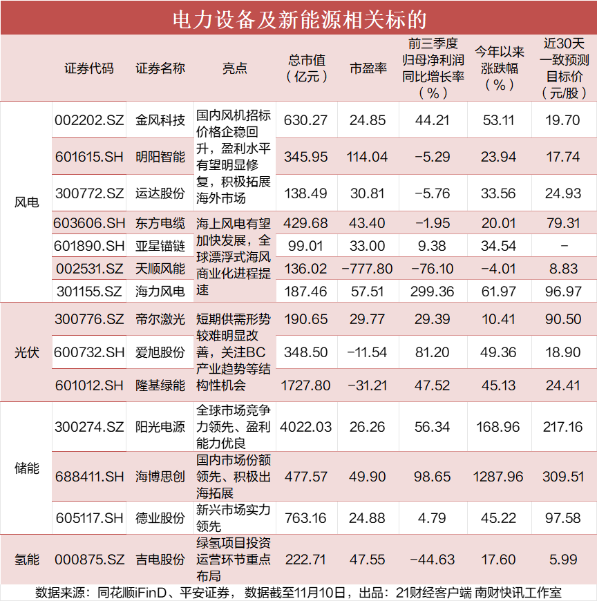 板块市场表现 - 11月11日光伏设备板块爆发,中来股份开盘10分钟实现20cm涨停,国晟科技、协鑫集成、金辰股份涨停,同享科技、快可电子、阿特斯等多只概念股跟涨 [1] 政策驱动因素 - 11月10日国家发展改革委、国家能源局发布指导意见,旨在增强新型电力系统对新能源适配能力 [1] - 政策内容包括大力推进技术先进、安全高效的新型储能建设,挖掘新能源配建储能调节潜力,并创新应用液流电池、压缩空气储能、重力储能等多种技术路线,加快突破大容量长时储能技术 [1] 储能行业前景 - 储能保持高景气度,近期国内储能电芯及系统价格均稳定上涨,主要由于集成厂商海外订单持续增长及电芯原材料成本显著上升 [2] - 碳酸锂及正极材料价格回暖,六氟磷酸锂与电解液供应趋紧,预计11月部分厂商报价重心进一步上移,短期内成交价格或将继续小幅攀升 [2] - 预计明年全球储能增速保持在40%以上,此前市场预计今年增速为40%-50%,明年为10%-20% [2] - 国内独立储能爆发力增强,预计明年总量可能增长至200吉瓦时以上,非美国海外市场也将继续保持强劲增长 [2] 风电行业分析与标的 - 国内风机招标价格企稳回升,后续风机企业盈利水平有望明显修复,同时风机企业积极拓展海外市场,建议重点关注金风科技、明阳智能、运达股份 [3] - 国内深远海海上风电有望加快发展,全球漂浮式海风商业化进程提速,建议重点关注东方电缆、亚星锚链、天顺风能、海力风电 [3] - 金风科技总市值630.27亿元,市盈率24.85,前三季度归母净利润同比增长44.21% [4] - 明阳智能总市值345.95亿元,市盈率114.04,前三季度归母净利润同比增长-5.29% [4] - 运达股份总市值138.49亿元,市盈率30.81,前三季度归母净利润同比增长-5.76% [4] - 东方电缆总市值429.68亿元,市盈率43.40,前三季度归母净利润同比增长-1.95% [4] - 亚星锚链总市值99.01亿元,市盈率33.00,前三季度归母净利润同比增长9.38% [4] - 天顺风能总市值136.02亿元,市盈率-777.80,前三季度归母净利润同比增长-76.10% [4] - 海力风电总市值187.46亿元,市盈率57.51,前三季度归母净利润同比增长299.36% [4] 光伏行业分析与标的 - 光伏短期供需形势较难明显改善,建议关注BC产业趋势等结构性机会,相关标的包括帝尔激光、爱旭股份、隆基绿能 [3] - 帝尔激光总市值190.65亿元,市盈率29.77,前三季度归母净利润同比增长29.39% [4] - 爱旭股份总市值348.50亿元,市盈率-11.54,前三季度归母净利润同比增长81.20% [4] - 隆基绿能总市值1727.80亿元,市盈率-31.21,前三季度归母净利润同比增长47.52% [4] 储能行业分析与标的 - 国内独立储能收益模式成型,海外非美大储市场机遇可期,推荐全球市场竞争力领先、盈利能力优良的阳光电源 [3] - 推荐国内市场份额领先、积极出海拓展的海博思创 [3] - 新兴市场户储和欧洲工商储需求依然向好,推荐新兴市场实力领先的德业股份 [3] - 阳光电源总市值4022.03亿元,市盈率26.26,前三季度归母净利润同比增长56.34% [4] - 海博思创总市值477.57亿元,市盈率49.90,前三季度归母净利润同比增长98.65% [4] - 德业股份总市值763.16亿元,市盈率24.88,前三季度归母净利润同比增长4.79% [4] 氢能行业分析与标的 - 氢能方面,关注在绿氢项目投资运营环节重点布局的企业,建议关注吉电股份 [3] - 吉电股份总市值222.71亿元,前三季度归母净利润同比增长47.55% [4]