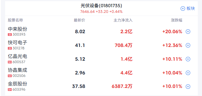 11月11日,A股震荡调整。截至收盘,上证指数跌0.39%,深证成指跌1.03%,创业板指跌1.4%。 市场缘何风云突变?分析人士认为,可能与三大变量有关。 一是,美元指数走强预期还在增加。据悉,交易员正加紧为美元波动性上升做准备,与美元现货指数挂 钩的一个月期权合约成本升至近一周以来的最高水平。 点评:消息面上,11月10日,国家发改委、国家能源局发布关于促进新能源消纳和调控的指导意见,意 见提到,大力推进技术先进、安全高效的新型储能建设;到2030年,满足全国每年新增2亿千瓦以上新 能源合理消纳需求,助力实现碳达峰目标。 | | | 光伏设备(01801735) | + 板块 | | --- | --- | --- | --- | | | | 7646.64 +33.20 +0.44% | | | 股票名称 | 最新价 | 主力净流入 | 涨跌幅 | | 中来股份 6 300393 | 8.02 | 2.2亿 | +20.06% (+) | | 快可电子 6 301278 | 41.1 | 708.4万 | +12.36% (+) | | 亿晶光电 SH 600537 | 5.12 | 1.4亿 | +1 ...