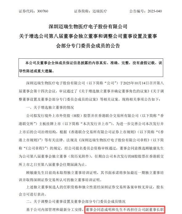 迈瑞医疗刚启动港股上市 副董事长辞职!