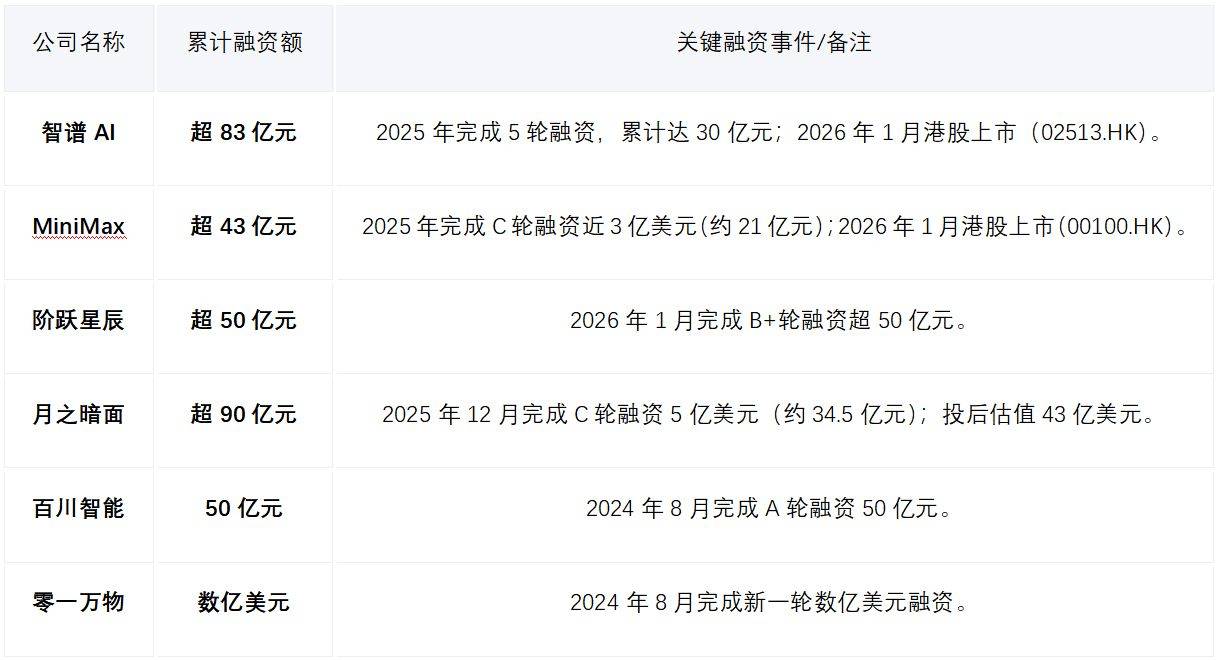阶跃星辰B+轮融资事件 - 阶跃星辰于2026年1月26日完成超50亿元人民币的B+轮融资 创下了过去12个月中国大模型赛道单笔最高融资纪录 [1] - 本轮融资的参投方包括上国投先导基金 国寿股权 浦东创投 徐汇资本 无锡梁溪基金 厦门国贸 华勤技术等产业投资人 腾讯 启明 五源等老股东进一步跟投 [1] AI“六小虎”融资格局 - 根据公开资料统计 中国AI大模型领域的“六小虎”累计融资额分别为 智谱AI超83亿元 MiniMax超43亿元 阶跃星辰超50亿元 月之暗面超90亿元 百川智能50亿元 零一万物为数亿美元 [2] - 智谱AI在2025年完成5轮融资累计达30亿元 并于2026年1月港股上市 MiniMax在2025年完成近3亿美元(约21亿元人民币)的C轮融资 并于2026年1月港股上市 [2] - 月之暗面在2025年12月完成5亿美元(约34.5亿元人民币)的C轮融资 投后估值达43亿美元 [2] 阶跃星辰的公司背景与技术实力 - 阶跃星辰成立于2023年4月 由微软原全球副总裁姜大昕创立 联合创始人包括前旷视研究院院长张祥雨和前微软亚洲研究院研究员朱亦博 [4] - 公司已发布22款自研基座模型 其中包括16款多模态模型 核心模型包括Step-1千亿参数语言大模型 Step-1V千亿参数多模态大模型以及Step-2万亿参数MoE语言大模型 [4] - 公司的产品覆盖语音交互 图像视频生成 多模态理解等领域 并已落地于OPPO 荣耀 吉利汽车等手机厂商的量产机型以及金融 汽车等行业场景 [4] 与吉利汽车的战略协同关系 - 阶跃星辰董事长印奇同时担任吉利控股集团旗下千里科技的董事长 千里科技前身为重庆力帆 后被吉利全资收购 印奇在获得力帆科技19.9%的股份后成为其董事长 [4] - 阶跃星辰的发展战略强调与智能手机 智能汽车等终端结合 走向“物理AI” 这与吉利汽车的智能化需求高度契合 印奇的双重身份有助于推动大模型与吉利智能汽车 低空经济等终端的深度结合 [6][7] - 吉利汽车在2030年战略中提出实现全球销量650万辆 营收突破万亿元的目标 这需要在智能驾驶 智能座舱等多个领域实现技术领先 AI大模型能力是其关键支撑 吉利构建的“天地一体化”未来出行生态也属于物理AI范畴 [6] 阶跃星辰的差异化路径与发展前景 - 相较于其他AI公司(如智谱 AI MiniMax 月之暗面 百川智能 零一万物) 阶跃星辰选择了更侧重与物理终端结合的差异化发展路径 [6] - 背靠吉利汽车 阶跃星辰获得了坚实的研发资金保障和丰富的应用场景(吉利年销量超400万辆车) 有助于实现商业闭环 [7] - 吉利汽车作为全球第七大车企 拥有资金和资源优势 未来存在将阶跃星辰收入囊中 使其成为其万亿营收战略一部分的可能性 [7]