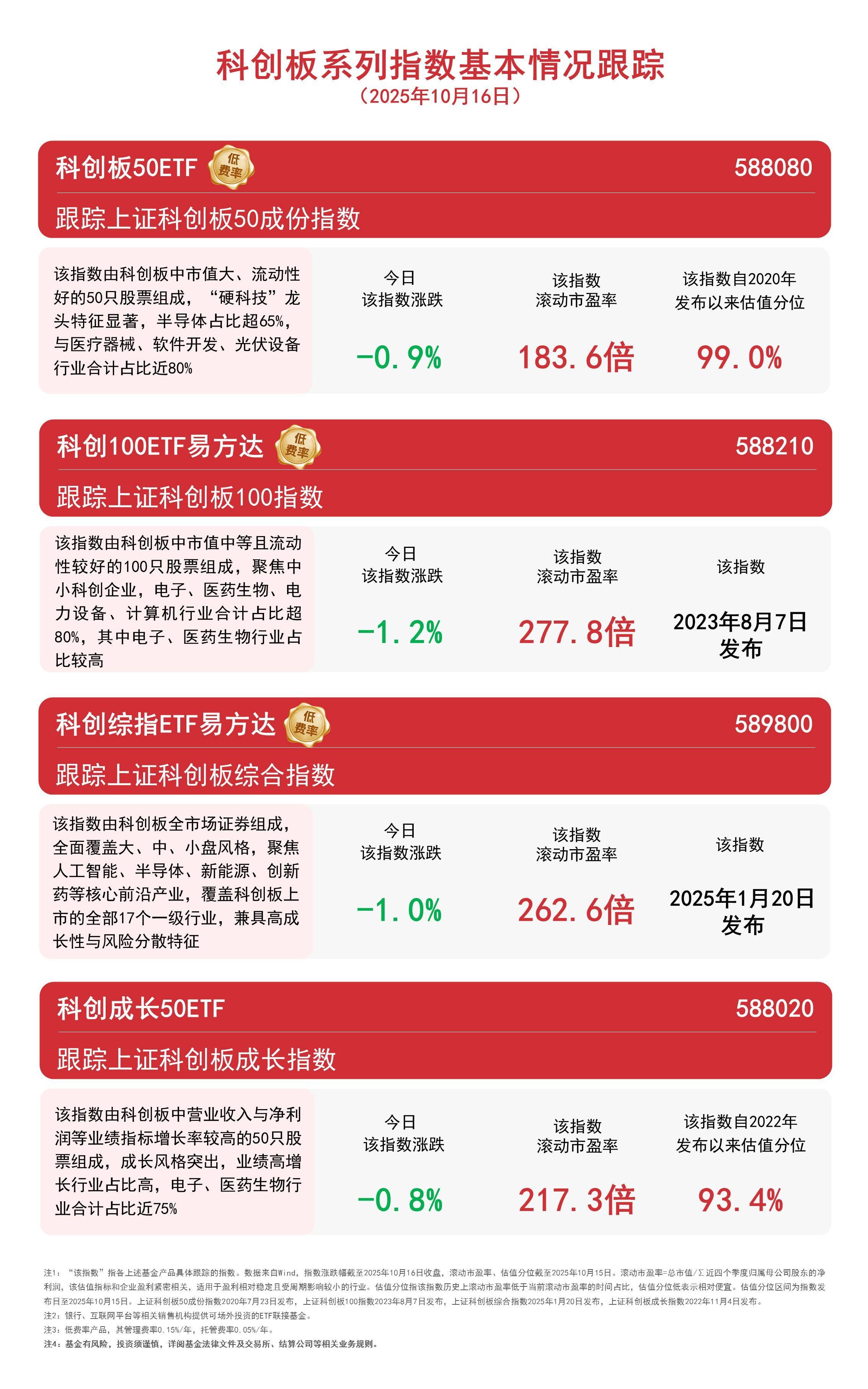市场板块表现 - 创新药和医疗器械个股表现活跃,半导体板块走弱 [1] - 科创成长指数下跌0.8%,科创板50指数下跌0.9%,科创综指下跌1%,科创100指数下跌1.2% [1] 科创板50ETF (588080) 概况 - 截至最新数据,科创板50ETF规模为743亿元,位列同类产品第一 [1] - 该ETF管理费率加托管费率合计为0.2%/年 [1] - 该ETF将于本月进行上市以来首次分红,也是跟踪科创板50指数的所有ETF的首次分红 [1] 科创板50ETF分红详情 - 分红方案为每持有10份基金份额可获得0.14元现金分红 [1] - 权益登记日为10月16日,除息日为10月17日,现金红利发放日为10月22日 [1] 科创板指数构成与特征 - 科创综指由科创板全市场证券组成,覆盖大、中、小盘风格 [6] - 指数聚焦人工智能、半导体、新能源、创新药等核心前沿产业,覆盖科创板全部17个一级行业 [6] - 科创成长指数由科创板中营业收入与净利润增长率较高的50只股票组成,成长风格突出 [6] - 科创板小盘企业主要集中在电子、医药生物、电力设备、计算机行业,合计占比超过80%,其中电子和医药生物行业占比较高 [4]