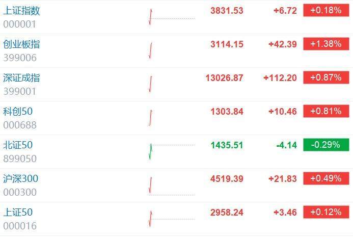 | 上证指数 | 3831.53 | +6.72 | +0.18% | | --- | --- | --- | --- | | 000001 | | | | | 创业板指 | 3114.15 | +42.39 | +1.38% | | 399006 | | | | | 深证成指 | 13026.87 | +112.20 | +0.87% | | 399001 | | | | | श्रीलिप | 1303.84 | +10.46 | +0.81% | | 000688 | | | | | 北证50 | 1435.51 | -4.14 | -0.29% | | 899050 | | | | | 沪深300 | 4519.39 | +21.83 | +0.49% | | 000300 | | | | | 上证50 | 2958.24 | +3.46 | +0.12% | | 000016 | | | | 格隆汇12月17日|A股主要指数走强,创业板指涨1.38%,沪指涨0.18%,深成指涨0.87%。算力硬件、 锂电、医药商业等方向涨幅居前,沪深京三市上涨个股近2900只。 ...