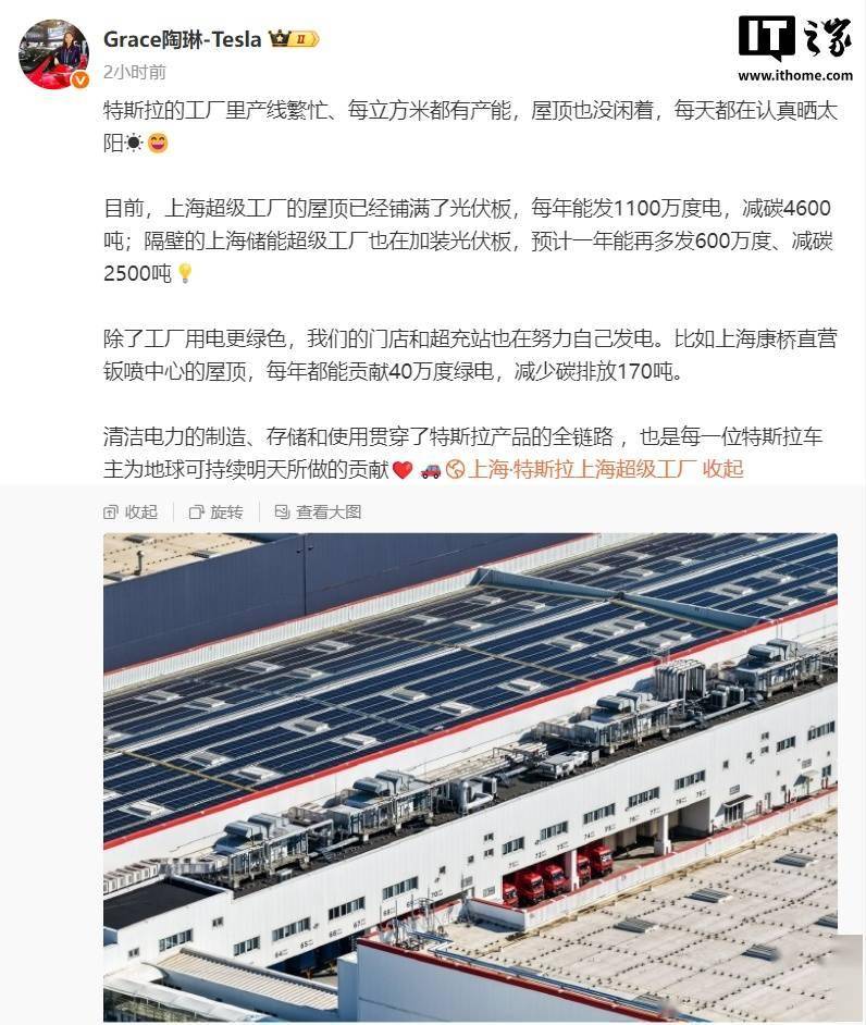IT之家 10 月 28 日消息,特斯拉公司副总裁陶琳今日发文透露,目前,上海超级工厂的屋顶已经铺满了光伏板,每年能发 1100 万度电,减碳 4600 吨;隔壁 的上海储能超级工厂也在加装光伏板,预计一年能再多发 600 万度、减碳 2500 吨。 此外,特斯拉的门店和超充站也在努力自己发电。比如上海康桥直营钣喷中心的屋顶,每年都能贡献 40 万度绿电,减少碳排放 170 吨。 特斯拉上海储能超级工厂自 2 月正式投产以来,成为特斯拉全球范围内第二座储能超级工厂。其主要产品为 Megapack 储能系统,规划年产能为 40 GWh (吉瓦时)。 据IT之家此前报道,特斯拉上海储能超级工厂于 2024 年 5 月正式在上海临港新片区开工建设。从开工到产品下线,仅用时 9 个月,比特斯拉汽车上海超级 工厂的用时缩短了 3 个月。 ...