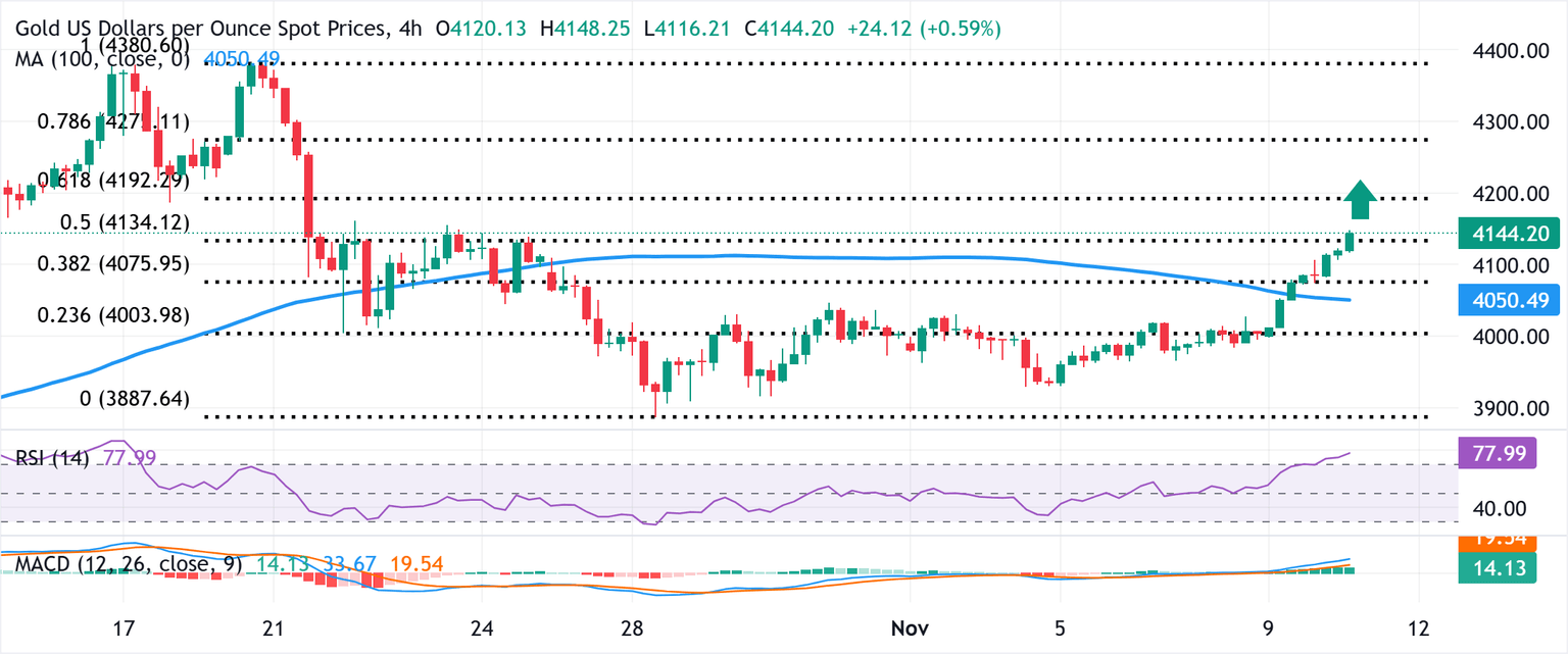 事实上,密歇根大学周五公布的调查显示,11月份美国消费者信心指数跌至50.3,为2022年6月以来的最低水平,低于上月的53.6。此外,投资者似乎倾向于 美联储采取更为鸽派的立场,这继续支撑着不产生收益的黄金。 由于市场预期美联储将进一步降息,黄金价格获得了一些后续上涨动力。 美国政府停摆引发的经济担忧也对黄金价格构成利好。 乐观的市场情绪和美元的小幅上涨并未削弱黄金/美元的看涨势头。 黄金(XAU/USD)在欧洲交易时段前半段维持了小幅日内涨幅,目前交易价格略低于本周二触及的近三周高点。对美国历史上持续时间最长的政府停摆可 能带来的经济影响的担忧,成为支撑避险商品需求的关键因素。除此之外,市场预期美联储将在12月再次降息,这也进一步提振了这种无息黄金。 与此同时,美国政府重启的积极进展也进一步提振了本已乐观的市场情绪。除此之外,由于美国银行假日导致交易量相对清淡,美元买盘的出现抑制了交易 员对黄金/美元货币对(XAU/USD)的积极做多。然而,市场对美联储鸽派政策的预期可能会限制美元的涨幅,并暗示金价上涨的可能性更大。 每日市场动态:经济担忧和对美联储鸽派政策的预期继续支撑金价 参议院周日晚间达成妥协,推进 ...