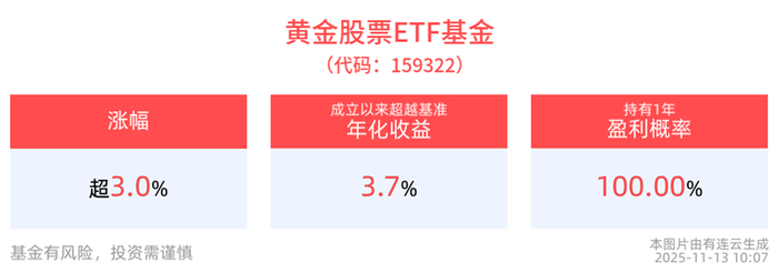 贵金属市场价格表现 - 周三纽约尾盘现货黄金价格显著上涨1.69%,报收于4196.54美元/盎司,盘中最高触及4211.79美元 [1] - COMEX黄金期货价格涨幅达2.15%,报收于4204.90美元/盎司 [1] - 现货白银价格大幅上涨4.26%,报收于53.4078美元/盎司,COMEX白银期货涨幅为5.19%,报收于53.380美元/盎司 [1] 黄金产业股票指数及ETF表现 - 中证沪深港黄金产业股票指数(931238)强势上涨3.10% [3] - 黄金股票ETF基金(159322)上涨3.05%,最新报价为1.62元,近一周累计上涨3.69% [3] - 该ETF基金近一年净值大幅上涨68.27%,在指数股票型基金中排名22/3157,位居前0.70% [4] - 基金自成立以来最高单月回报达20.05%,最长连涨月数为4个月,对应涨幅31.09%,历史持有1年盈利概率为100% [4] 成分股及权重股市场表现 - 指数成分股豫光金铅(600531)上涨8.05%,中国黄金国际(02099)上涨5.19%,紫金矿业(601899)上涨5.05% [3] - 前十大权重股合计占比67.97%,其中紫金矿业权重最高为13.06%,山东黄金权重为9.79% [5] - 十大重仓股普遍上涨,中国黄金国际涨幅5.19%,紫金矿业(02899)涨幅4.17%,铜陵有色涨幅4.03% [7] 机构观点与市场逻辑 - 机构分析认为美国GDP增速放缓及10月非农数据疲软强化了美联储降息预期,长期利好金价 [1] - 全球央行自年初以来持续增持黄金,反映出在美元信用周期下行背景下对多元化储备的需求上升 [1] - 贵金属中期逻辑依然通顺,后市行情被看好 [1] 基金产品特征与数据 - 黄金股票ETF基金近一年夏普比率为1.74,今年以来相对基准回撤3.00% [5] - 基金管理费率为0.50%,托管费率为0.10% [5] - 基金紧密跟踪中证沪深港黄金产业股票指数,该指数选取50只市值较大且业务涉及黄金采掘、冶炼、销售的上市公司证券作为样本 [5]