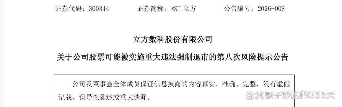 ST长药退市进程与股价异常波动 - 公司股票于2026年1月23日收出一字涨停板,股价报0.92元,为连续第4个20%的涨停,较最低0.43元已翻倍 [1] - 同日公司发布第13次终止上市风险提示公告,并公告股票将于1月26日起停牌,交易所将启动退市程序 [3] - 停牌复牌后,股票将进入为期15个交易日的退市整理期,随后正式退市,目前持有该股的股东为1.423万名 [3] ST长药触及多项退市指标 - 公司触及重大违法强制退市:2021年至2023年间,通过虚构业务累计虚增营业收入超过7亿元,利润造假比例最高年份达88.23% [5] - 公司触及交易类退市指标:自2025年12月下旬起,连续17个交易日收盘价低于1元面值 [5] - 公司触及财务类退市指标:预计2025年末净资产为负值,基本面崩塌,子公司破产、员工遣散,持续经营能力丧失 [5] “末日轮”炒作现象与风险 - ST长药等濒临退市公司股价被资金爆炒,这种背离基本面的暴涨被称为“末日轮”赌博 [7] - 炒作逻辑是制造股价活跃假象,吸引散户接盘,资金趁机脱身,最终进场投资者可能血本无归 [8] - 另一家面临重大违法退市的ST立方也出现类似炒作,股价从0.66元低位走出连续3个20%涨停,1月23日收涨13.91%至1.31元,公司发布公告明确表示上涨为市场炒作行为,基本面未变且退市风险未改 [10] 监管常态化退市与“零容忍”信号 - 2025年以来,已有超过16家因财务造假等重大违法行为触及退市条件的公司被清理出场 [12] - 2026年广道数字、东方通等公司摘牌,显示退市节奏常态化,监管目标是出清“害群之马”和“空壳僵尸”,引导资源至优质上市公司 [12] - 任何对问题公司的炒作都与当前政策导向相悖 [12] 其他公司退市风险预警 - ST摩登预告2025年预计亏损7456万元,为连续第五年亏损,年报披露后股票可能被终止上市 [12] - ST天龙已连续三年亏损,截至2025年三季度末净资产为负0.087元,若年报审计后净资产仍为负值,股票将被终止上市 [14] - ST熊猫预计2025年实现2100万元盈利,但提示若全年经审计营业收入低于3亿元,股票同样可能终止上市,目前股价为8.55元 [14][15] - ST奥维总市值已连续16个交易日低于5亿元,即使后续连续涨停也无法回到5亿元以上,已触及市值退市指标,股价连续9个一字跌停至0.73元 [17] 上市公司股东集中减持 - 2026年1月23日,多达23家上市公司发布股东减持计划公告 [17] - 安记食品控股股东计划减持公司总股本3%的股份,公司年内股价涨幅达192%至21.94元,预计套现1.55亿元 [18] - 物产金轮股东计划减持3%股份,预计套现1.08亿元,公司年内股价上涨62% [18] - 减持名单还包括国货航、广东明珠、方大特钢等多家公司,原因多为“自身资金需求”,但在股价高位集中发布带来短期压力 [18] 业绩预告揭示的潜在风险 - 帅丰电器发布2025年年度业绩预告,预计净利润亏损6200万元,同比大幅下降202%,且预计全年营业收入低于3亿元 [20] - 根据规则,若最终经审计净利润为负且营业收入低于3亿元,股票将在年报披露后被实施退市风险警示(戴帽ST),公司年内股价涨幅为87%至17.55元 [20]