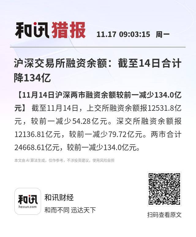 沪深交易所融资余额:截至14日合计降134亿