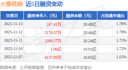 大秦铁路:11月13日融资净买入247.41万元,连续3日累计净买入5715.05万元