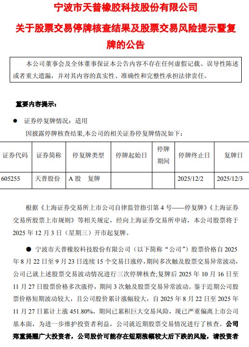 公司股票交易与复牌情况 - 公司已完成近期股票交易情况的核查工作 并向上海证券交易所申请复牌 [1] - 公司股票将于2025年12月3日(星期三)开市起复牌 [1] - 根据停复牌信息表 公司证券代码为605255 复牌日为2025年12月3日 [3] 股价异常波动与估值风险 - 公司股价自2025年8月22日至2025年11月27日累计上涨451.80% 期间已累积巨大交易风险 [4] - 公司股价已严重偏离上市公司基本面 未来可能有快速下跌的风险 [4] - 截至2025年11月27日 公司最新市盈率为605.87倍 市盈率和市净率显著高于行业平均水平 [4] - 公司外部流通盘相对较小 可能存在非理性炒作风险 [4] 控制权变更与收购方情况 - 公司控制权变更事项存在不确定性 相关审批程序能否通过及通过时间尚存在一定不确定性 [4] - 收购方中昊芯英已启动独立自主的IPO相关工作 现已进入股份制改制过程阶段 [4] - 未来36个月内 中昊芯英不存在通过公司借壳上市的计划或安排 [4] 要约收购具体条款与风险 - 本次要约收购期限共计30个自然日 自2025年11月20日起至2025年12月19日止 [4] - 要约收购价格为23.98元/股 投资者在期限内申报预受要约且未在规定时间前撤回 其股票将以此价格出售给收购方 [4][5] - 公司最近交易日(2025年11月27日)收盘价为147.00元/股 显著高于要约收购价格23.98元/股 [5] - 若股价维持147.00元/股 投资者接受要约将导致每股损失123.02元 [5] 本轮股价上涨背景与过程 - 公司本轮上涨起始于2025年8月22日 [5] - 上涨直接原因是2025年8月21日晚公司公告 中昊芯英及其一致行动人计划通过受让股权加增资的方式收购公司控制权 [5] - 消息披露后 2025年8月22日至9月23日 公司股票连续15个交易日涨停 [5] - 期间公司就股票交易波动进行了多次停牌核查 复牌后2025年10月16日至11月27日股价依旧多次涨停 [5]