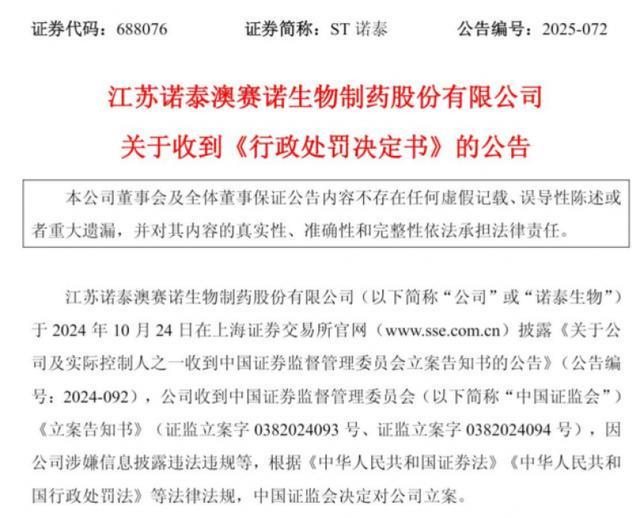 本报(chinatimes.net.cn)记者于娜 北京报道 近日,科创板上市药企诺泰生物(688076.SH)一纸公告打破资本市场平静,其正式确认收到中国证监 会出具的《行政处罚决定书》。这份处罚文书的落地,为这家曾凭减肥药概念声名鹊起的药企,画上了 违规造假的"实锤"句号,其资本市场的信任危机也随之浮出水面。 证监会处罚决定显示,诺泰生物因两大核心违法事实领罚:一是2021年年度报告存在虚假记载,二是公 开发行文件编造重大虚假内容。据此,监管部门对诺泰生物作出"责令改正、给予警告并罚款4740万 元"的处罚;同时对公司实际控制人赵德中、赵德毅等6名时任高管给予警告,合计罚款2880万元,本次 处罚总金额高达7620万元。 与此同时,上交所同步出台纪律处分措施,明确未来五年内不接受诺泰生物提交的发行上市申请文件, 且实际控制人赵德中三年内不适合担任上市公司董监高。这一系列重磅处罚不仅将诺泰生物推向融资受 限、声誉受损的双重困境,更对其后续的研发扩张与市场布局留下隐忧。 资金循环空转虚构收入 证监会《行政处罚决定书》详细披露了诺泰生物的两大违法事实,其违法时间跨度长、情节恶劣,涉及 上市首年业绩造假及后续可转 ...