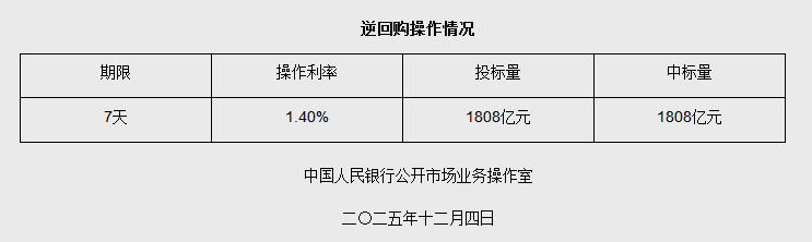 央行公开市场操作 - 中国人民银行于2025年12月4日开展了公开市场逆回购操作 [1] - 本次操作采用固定利率、数量招标方式 [1] - 操作规模为1808亿元人民币 [1] - 操作期限为7天 [1] - 中标利率维持在1.40% [1] - 投标量与最终中标量均为1808亿元,实现全额中标 [1]
