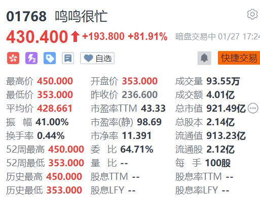 公司上市与市场表现 - 公司“鸣鸣很忙”为“零食很忙”和“赵一鸣零食”的母企,被称为“量贩零食第一股”,将于明日(1月28日)在香港挂牌上市,股票代码1768.HK [1] - 在富途暗盘交易中,股价盘中一度暴涨超过90%,最高触及450港元 [1] - 以暗盘最高价450港元计算,每手100股账面盈利达21340港元 [1] IPO发行详情 - 此次IPO共发售1410.11万股H股,其中香港公开发售占10%,国际配售占90% [1] - 每股招股价区间为229.6港元至236.6港元 [1] - 按最高招股价计算,本次IPO最多集资33.36亿港元 [1] 投资者认可与基石阵容 - IPO吸引了包括腾讯、淡马锡、贝莱德在内的8家顶级机构作为基石投资者 [1] - 基石投资者累计认购金额达1.95亿美元,显示出资本市场对其赛道地位和增长潜力的高度认可 [1] 暗盘交易数据摘要 - 暗盘交易期间,股价最终报收430.400港元,较招股价上限236.6港元上涨193.800港元,涨幅达81.91% [2] - 暗盘最高价450.000港元,最低价353.000港元,振幅41.00% [2] - 暗盘开盘价为353.000港元 [2] - 暗盘成交量为93.55万股,成交额为4.01亿港元 [2] - 暗盘平均成交价为428.661港元 [2] 公司估值与股本结构 - 按暗盘收盘价计算,公司总市值达921.49亿港元 [2] - 公司总股本为2.14亿股,其中流通股为2.12亿股 [2] - 流通市值约为913.23亿港元 [2] - 基于暗盘收盘价的市盈率(TTM)为43.33,静态市盈率为98.69 [2] - 市净率为11.391 [2] - 暗盘换手率为0.44% [2]